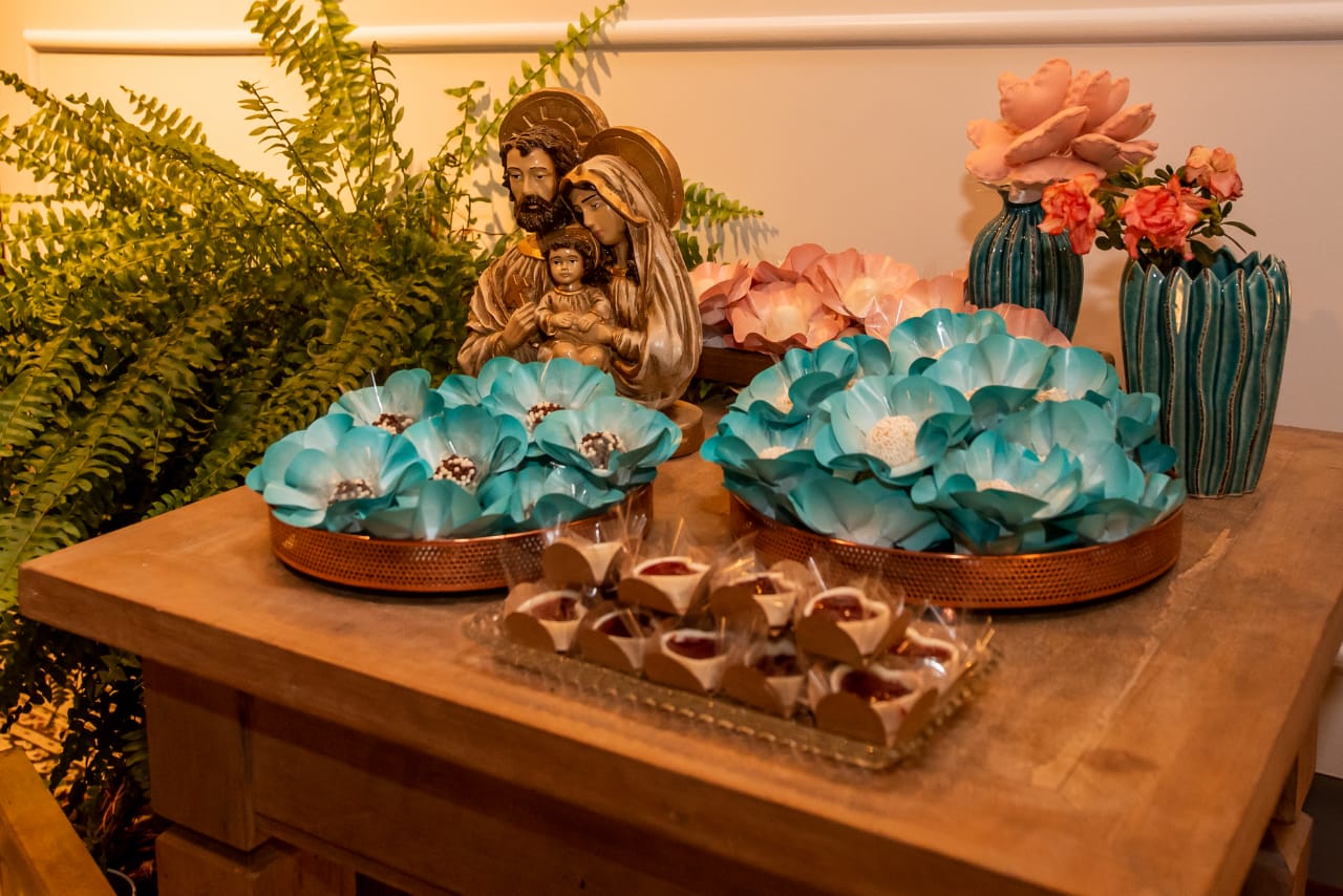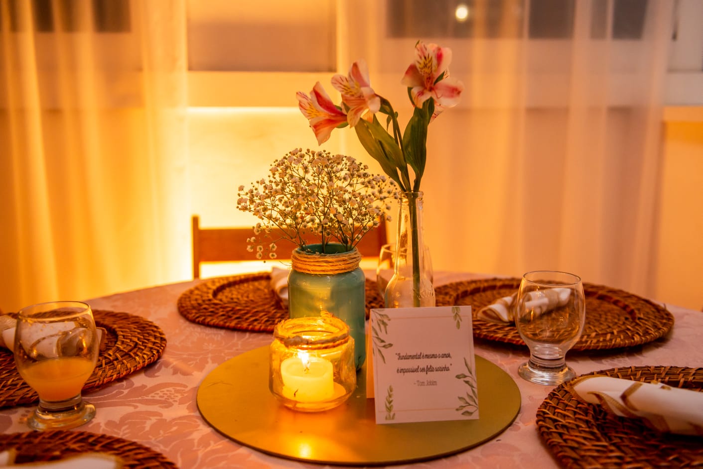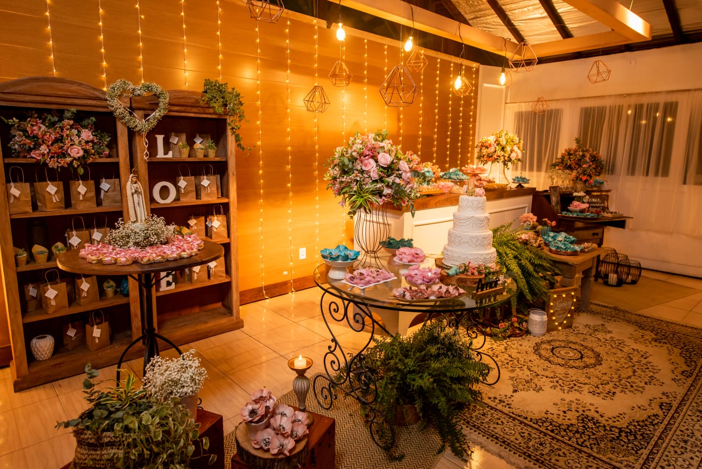 O local foi a escolha certa, a casa traz um ambiente aconchegante, tornando possível que a decoração romântica se estenda para fora da mesa principal, mas ocupe todo o espaço que recepcionou os concidados.