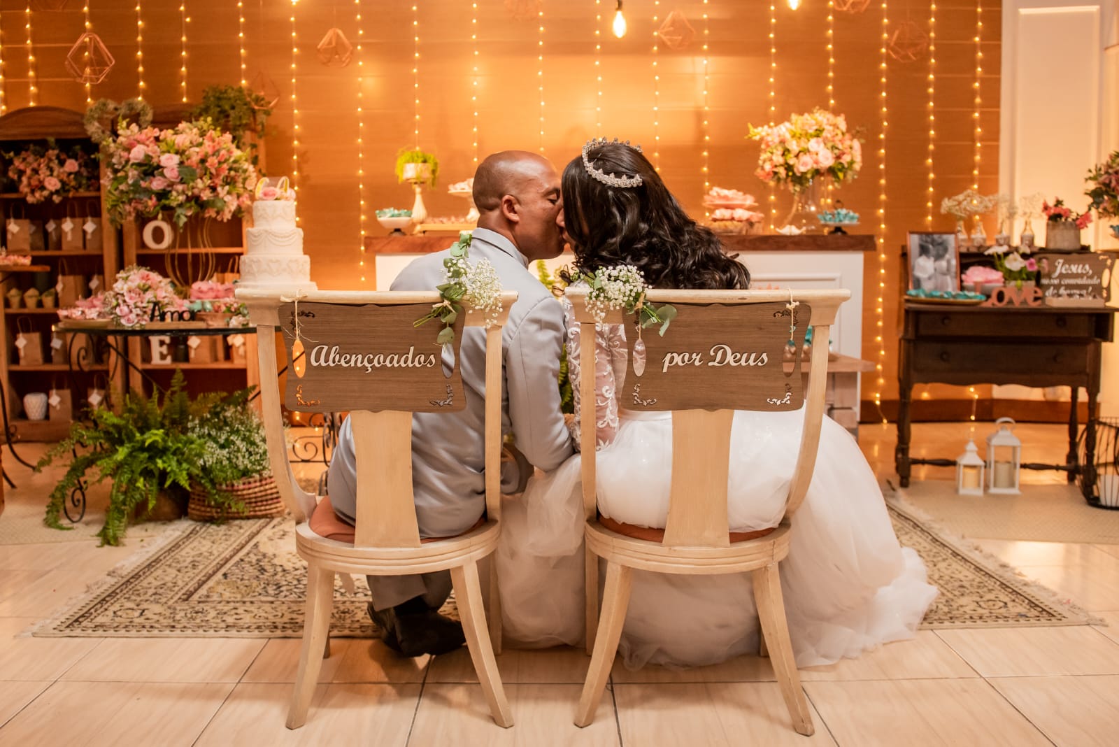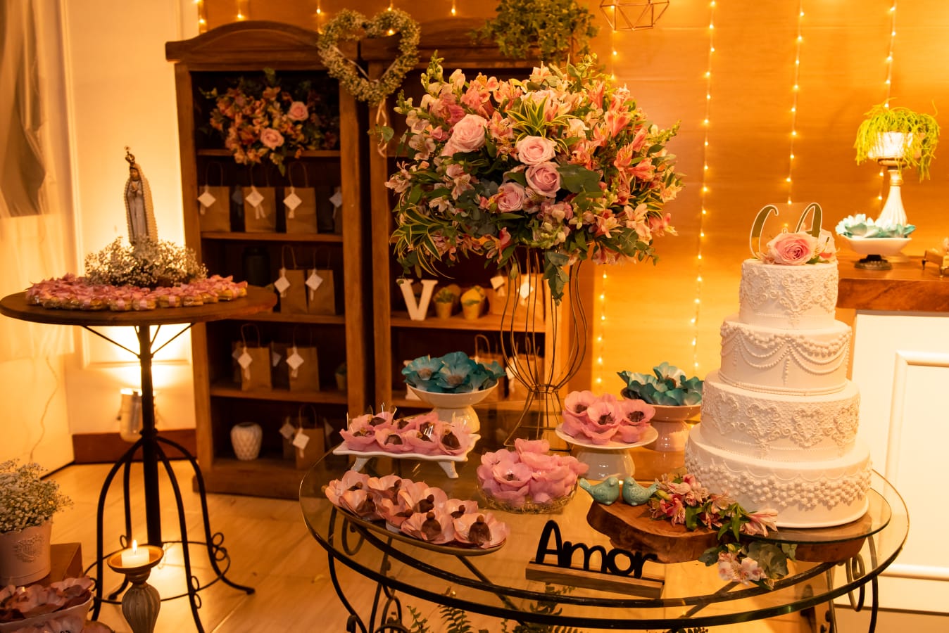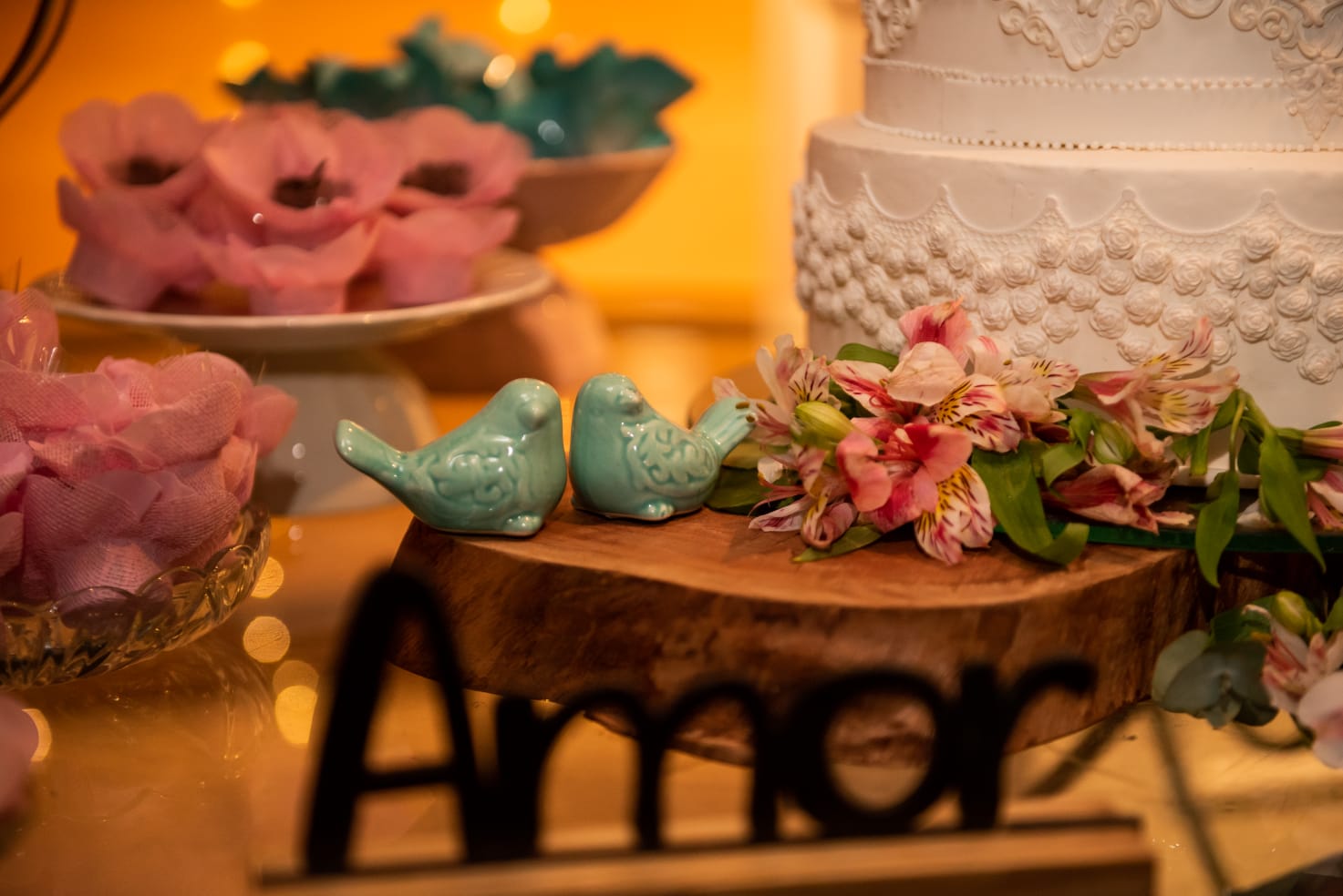 Ah, como essa decoração foi incrível de ser pensada. Os noivos, exemplos de amor e dedicação um ao outro, escolheram uma decoração bem romântica para celebrar esse dia especial. Foram escolhidos tons de rosa para trazer a delicadeza para esse momento, junto com tons de azul que foram utilizados para dar destaque em alguns pontos. Usamos composição de vários móveis, luzes retrô, flores e vasos decorativos para deixar essa decoração incrível e única para esse casal.