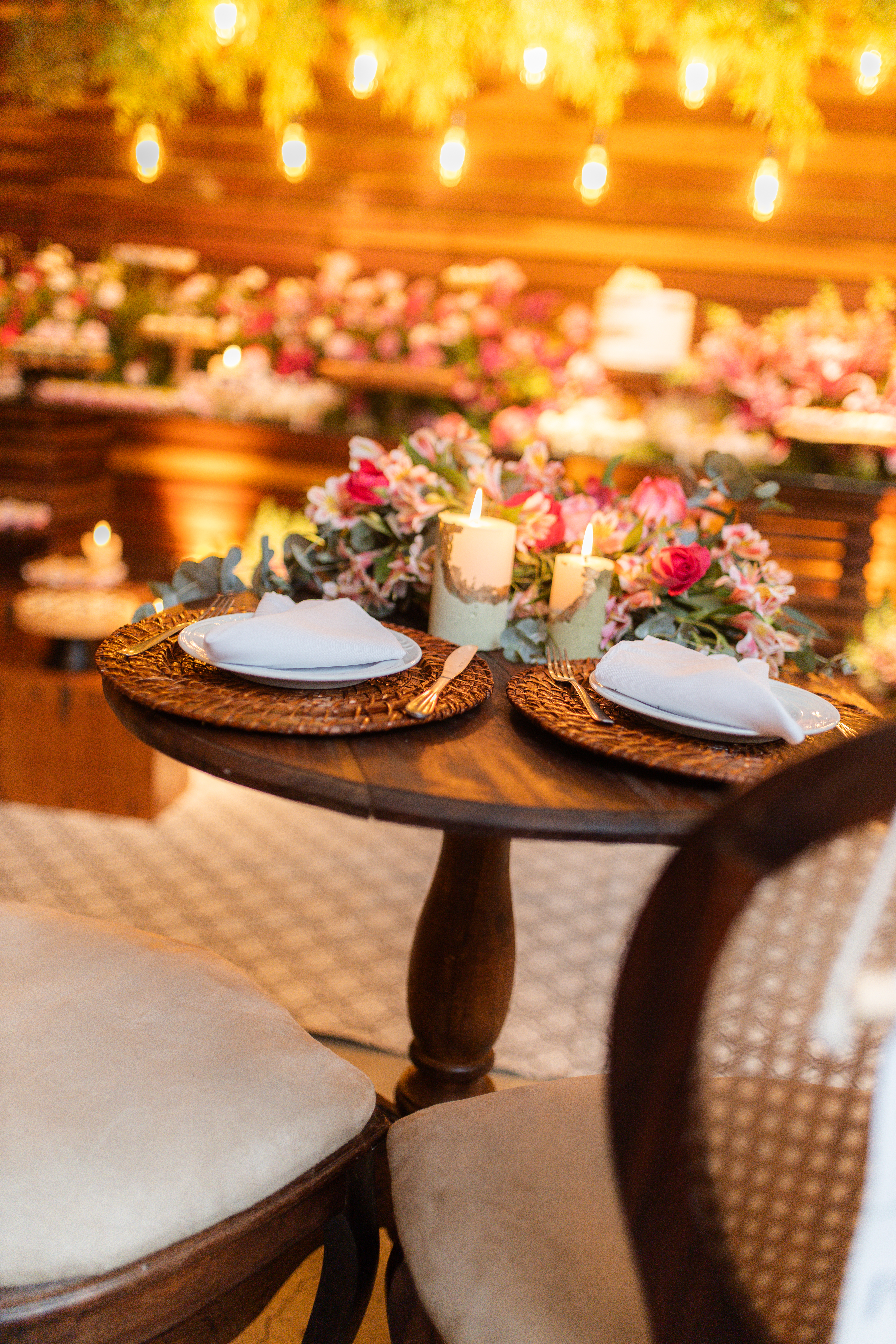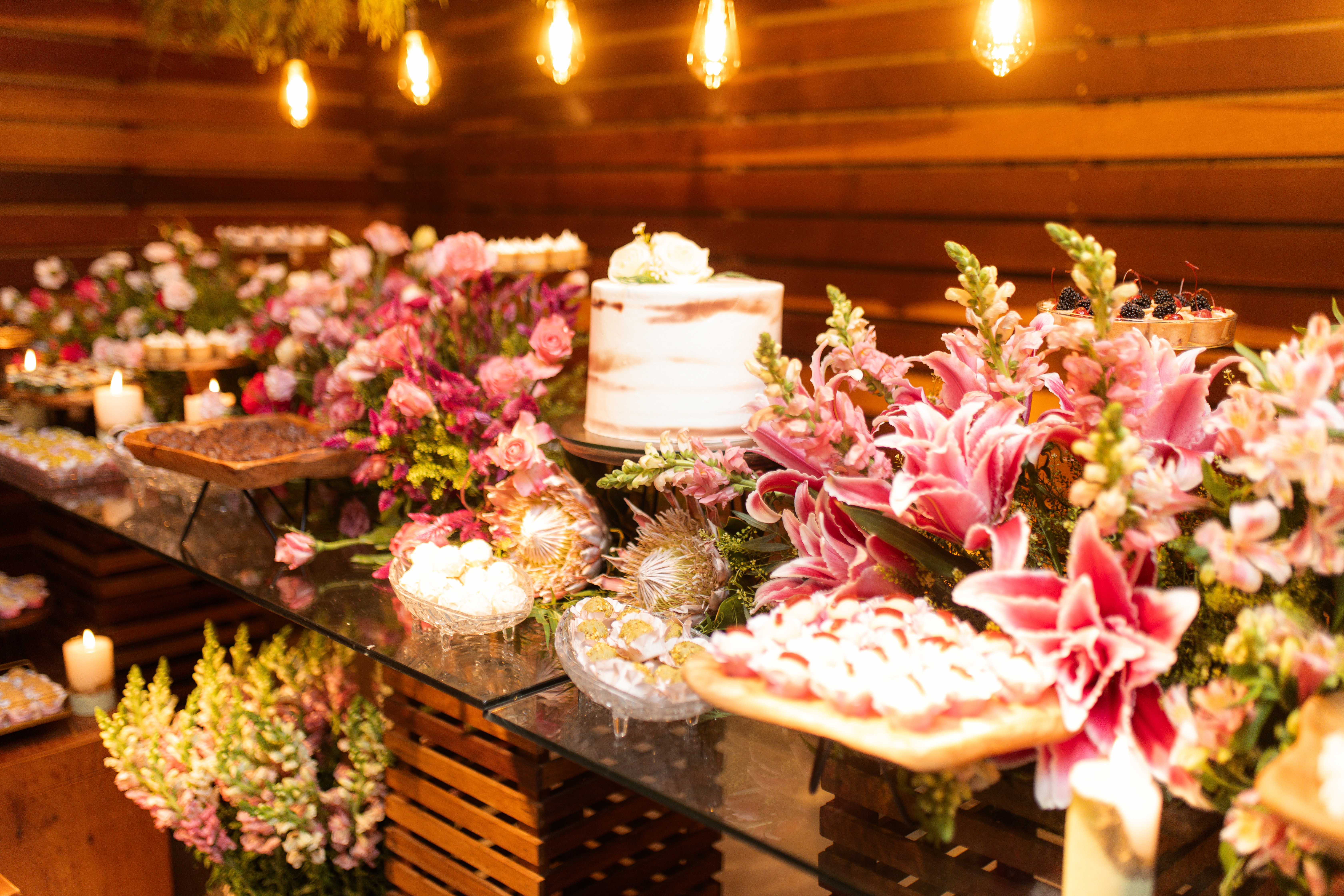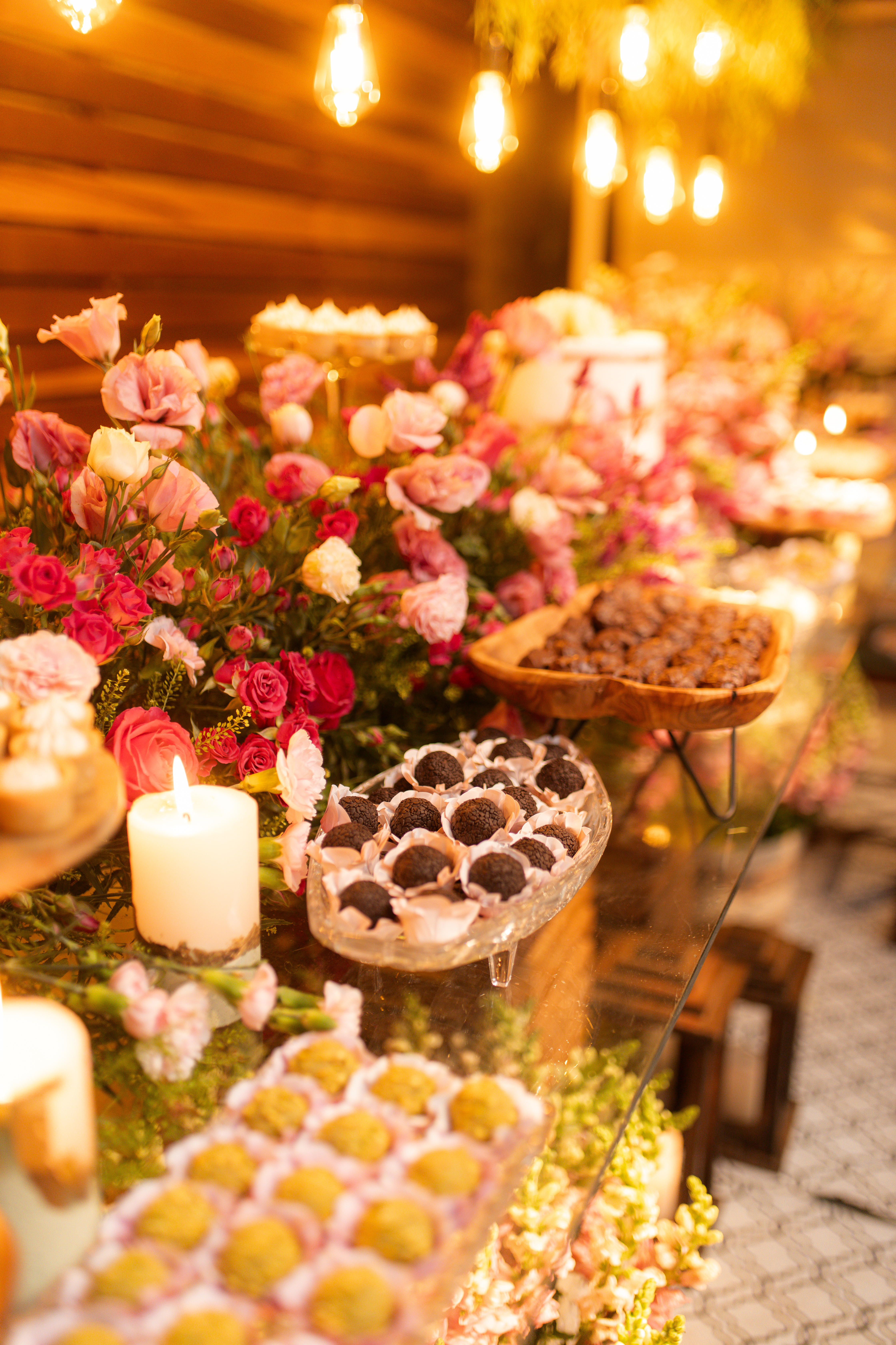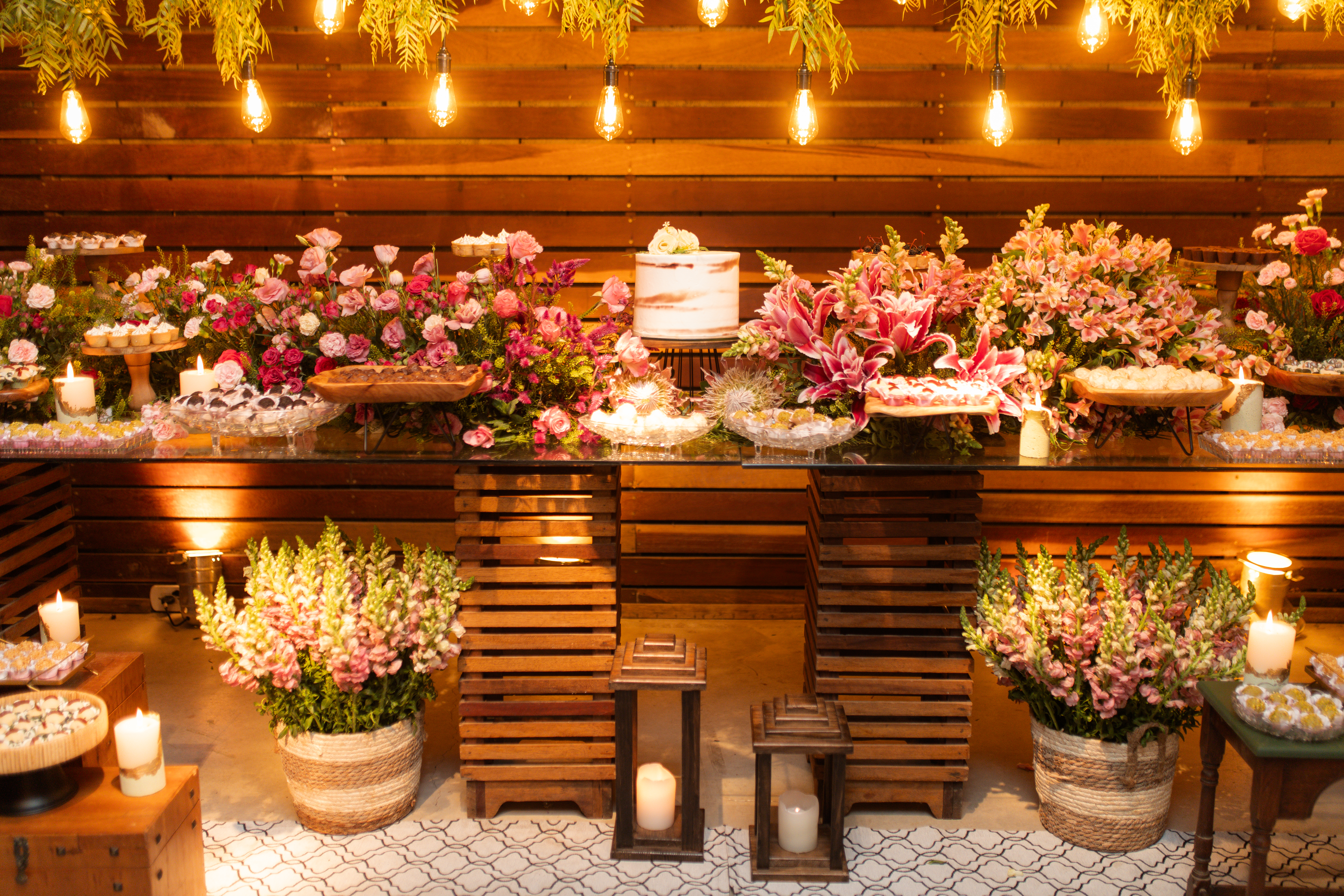 Para essa decoração os noivos escolheram tons de rosa para deixar o ambiente beeem romântico. A composição foi feita por diferentes flores em diferentes rosas, com doces finos, forminhas delicadas, uma arranjo inteiro na mesa formando um jardim e lâmpadas retrô para darem um charme no espaço.