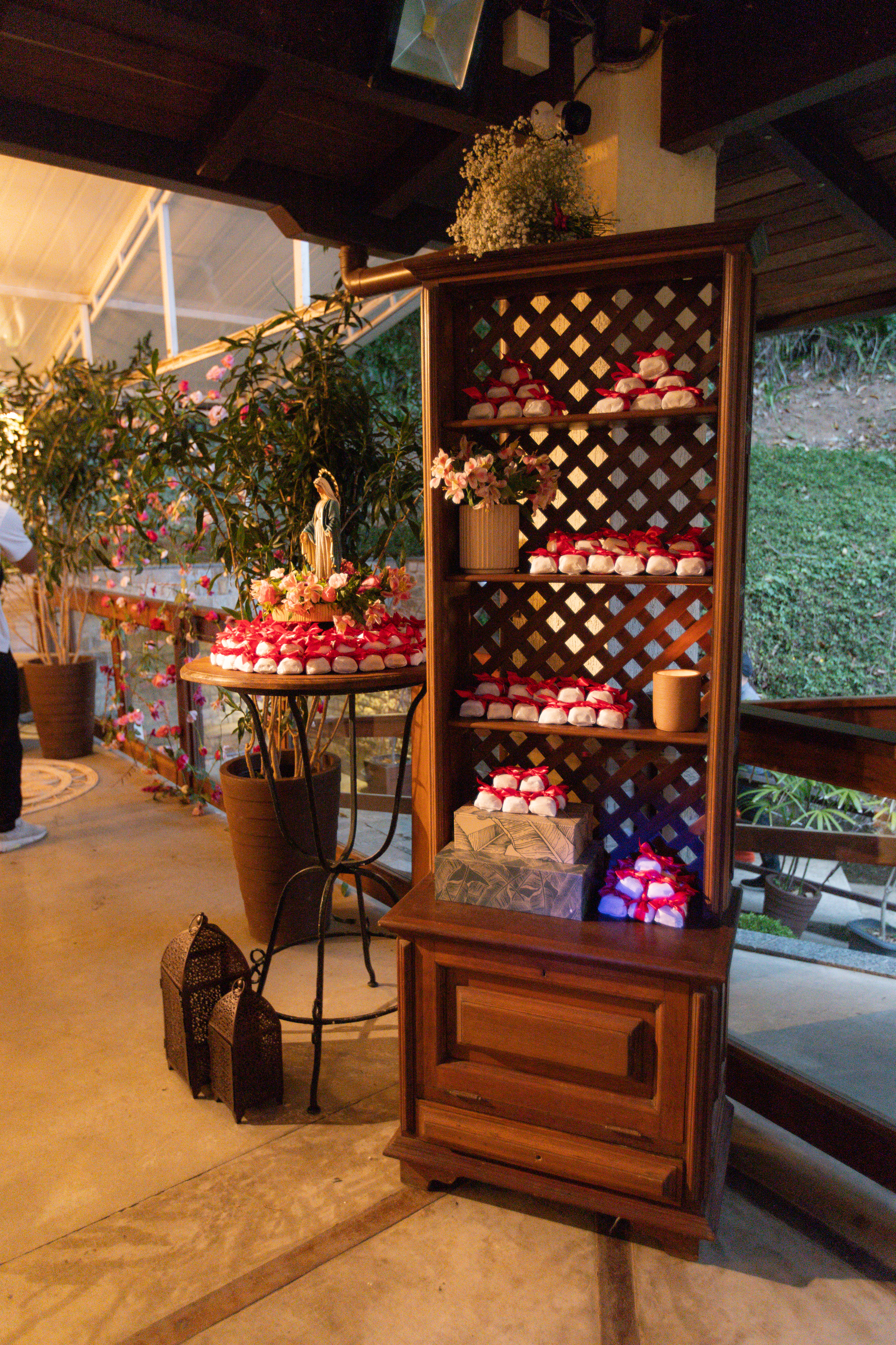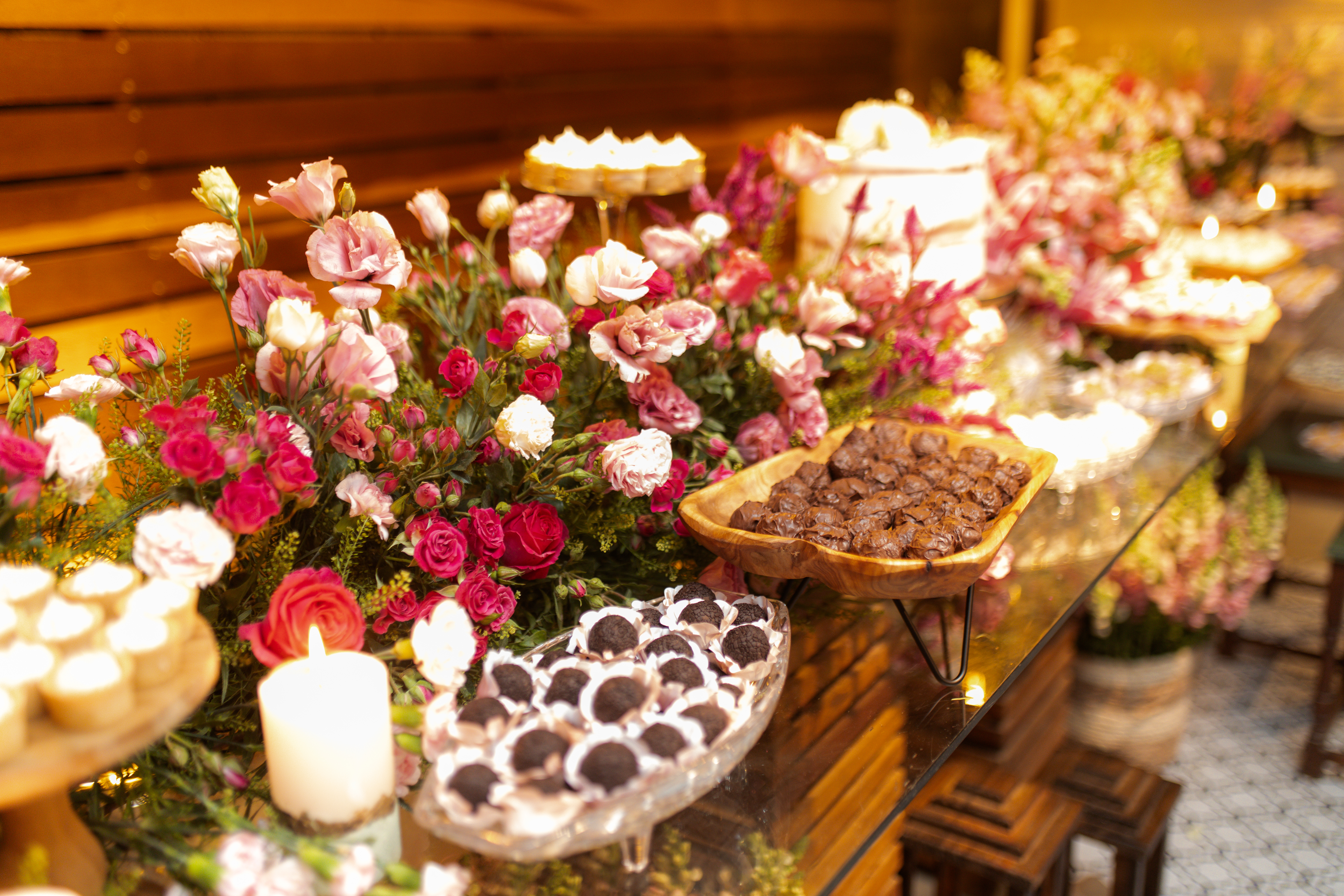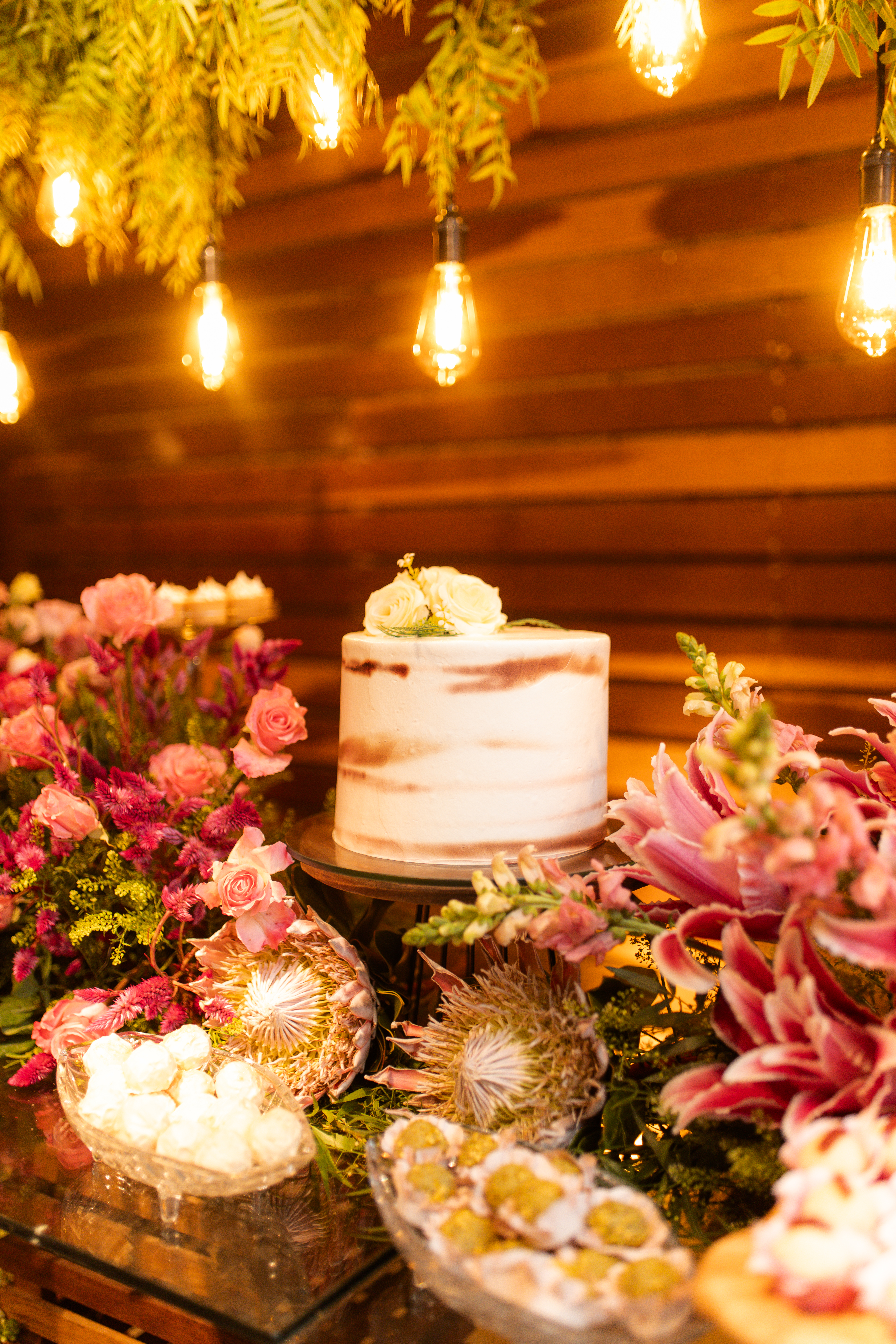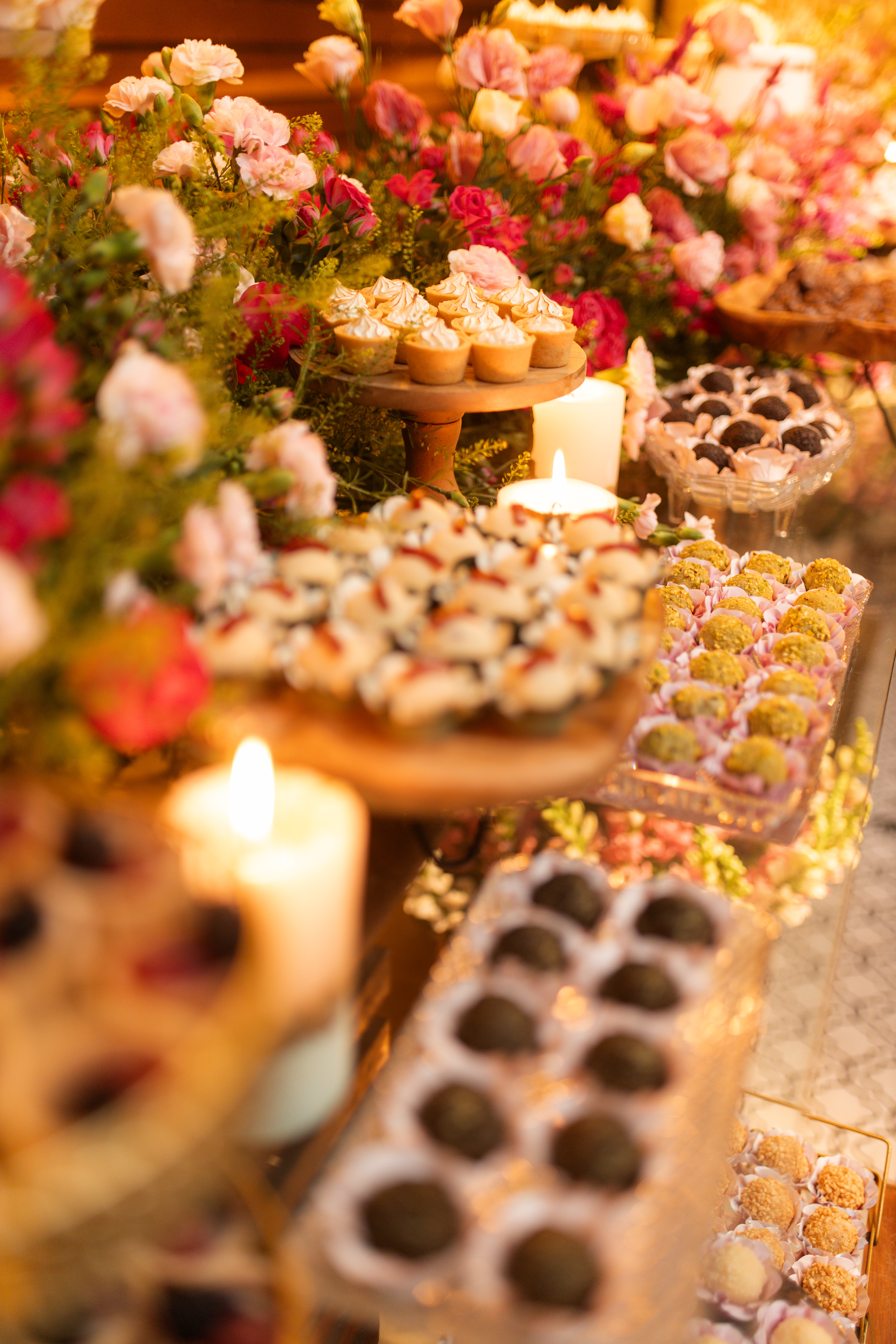 Para essa decoração os noivos escolheram tons de rosa para deixar o ambiente beeem romântico. A composição foi feita por diferentes flores em diferentes rosas, com doces finos, forminhas delicadas, uma arranjo inteiro na mesa formando um jardim e lâmpadas retrô para darem um charme no espaço.