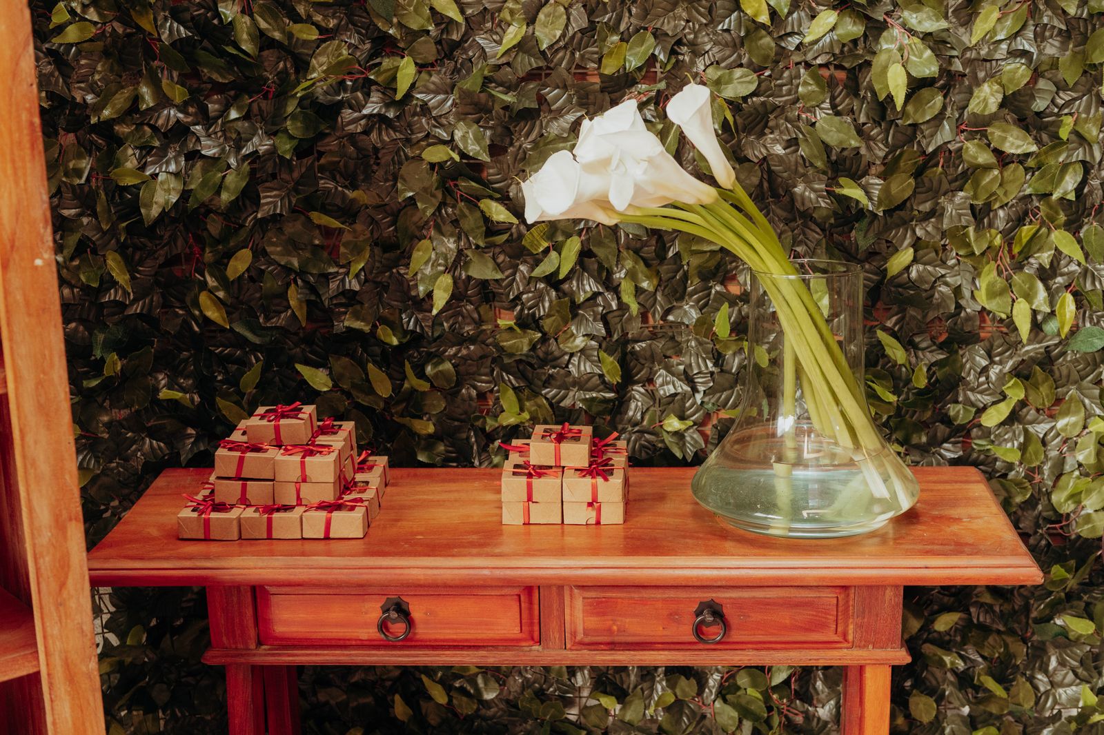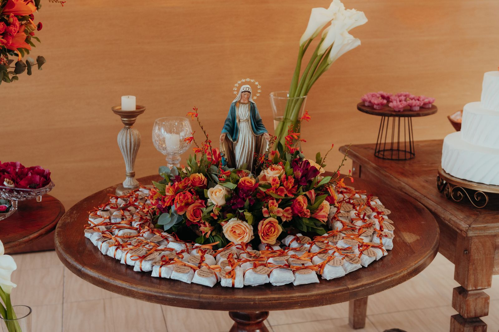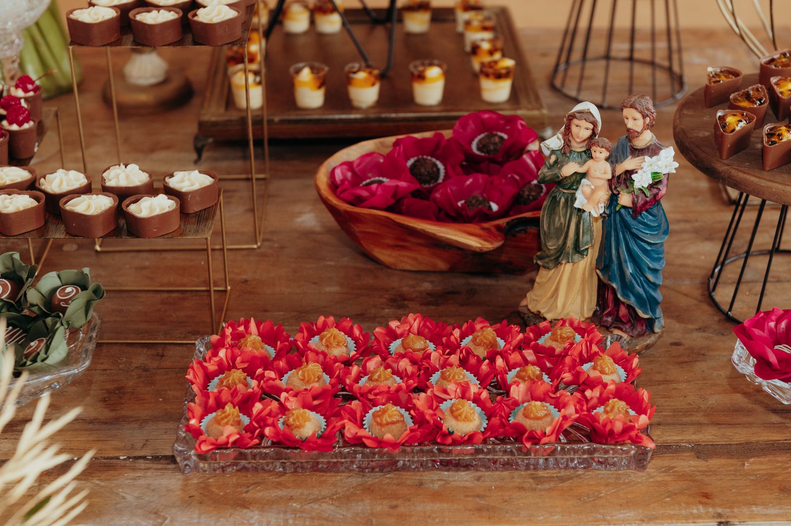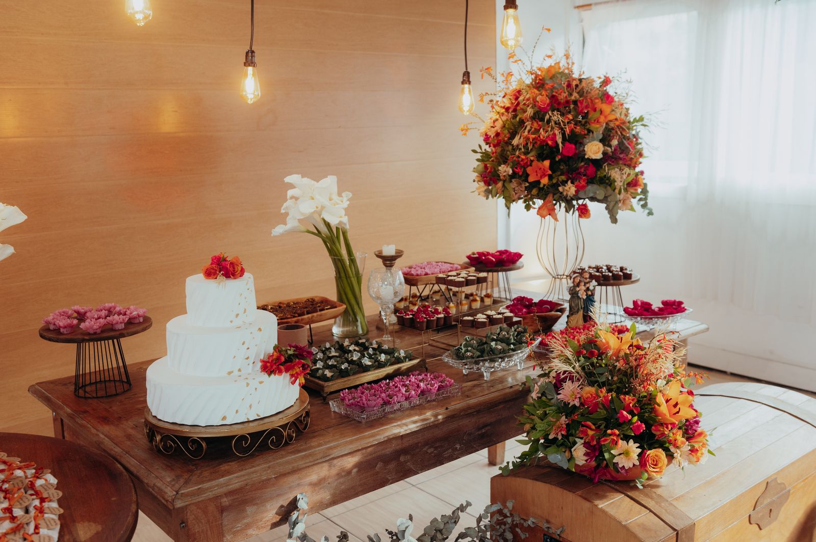 Nesse casamento, os noivos, jovens e descolados, optaram pela experiêencia de se viver a festa até o último momento. Eles trouxeram elementos únicos do casal, como a entrada diferente, a simplicidade e aconchego a toda à cerimônia. Os tons quentes, como vermelho, vinho, laranja, amarelo e marsala foram orndados com tons verder das folhagens naturais sob a mesa e no painel de entrada, que junto com as mesas em madeira e as composições usadas trouxeram um ar rústico romântico a essa decoração.
