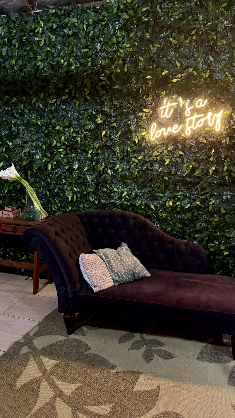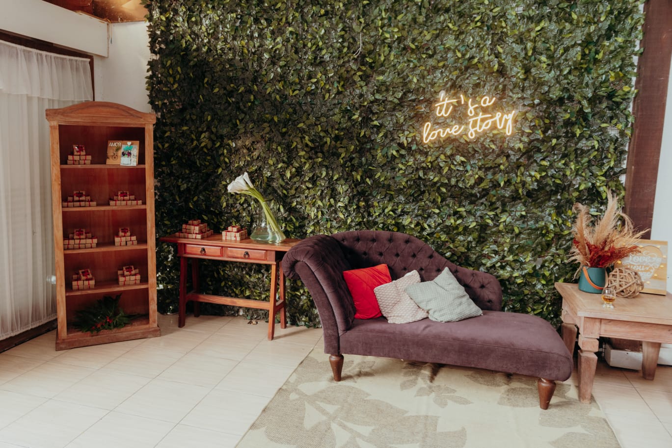 Junto com peças lindas pensadas especificamente para esse momento, os noivos pediram imagens que fazem parte da vida deles, copos de leite que a noiva ama e um cantinho fofo e aconchegante para que seus convidados pudessem tirar fotos e relaxar.