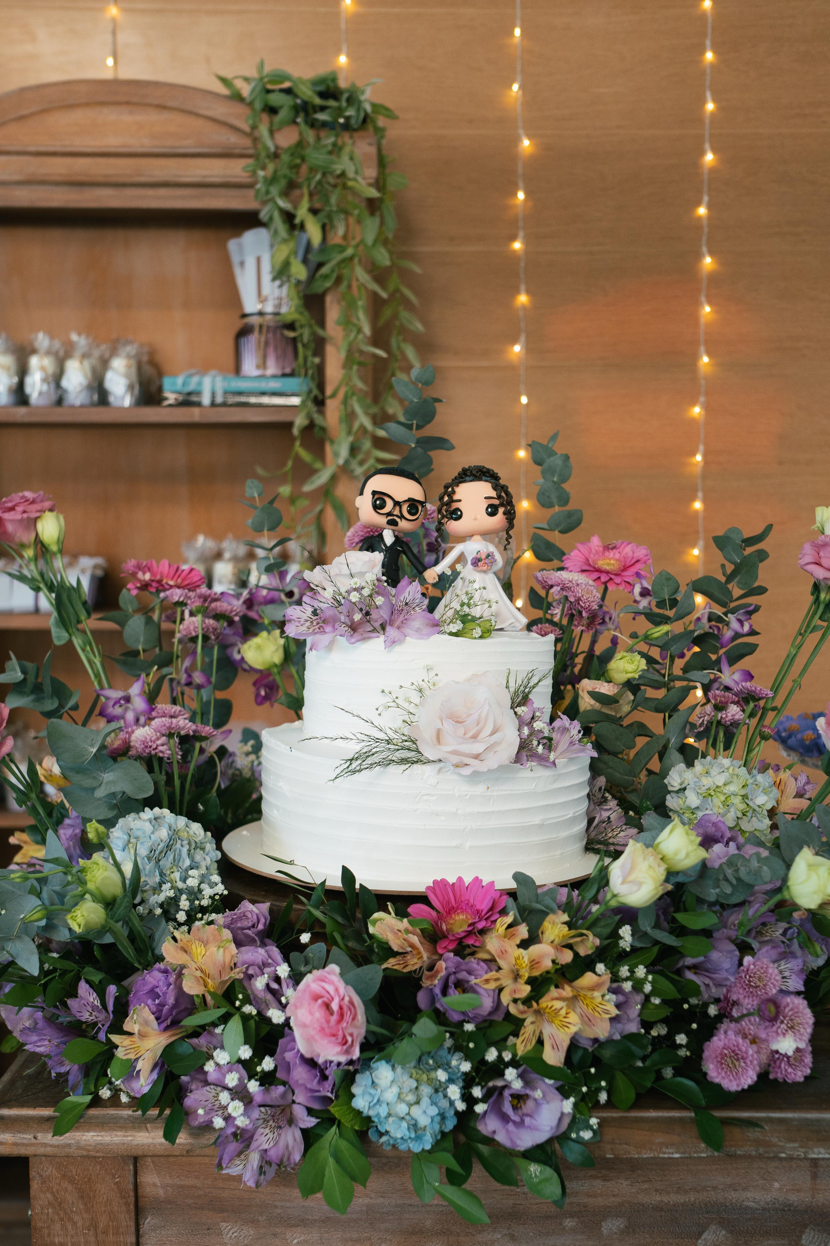 A mesa principal foi um dos destaques, cuidadosamente planejada para unir beleza e significado. O bolo branco, adornado por flores naturais, ganhou ainda mais personalidade com um topo divertido e cheio de carinho, refletindo a alegria e espontaneidade dos noivos. Ao redor, os doces artesanais foram dispostos de forma harmônica em bandejas que mesclaram tradição e sofisticação, transformando cada detalhe em uma obra de arte.