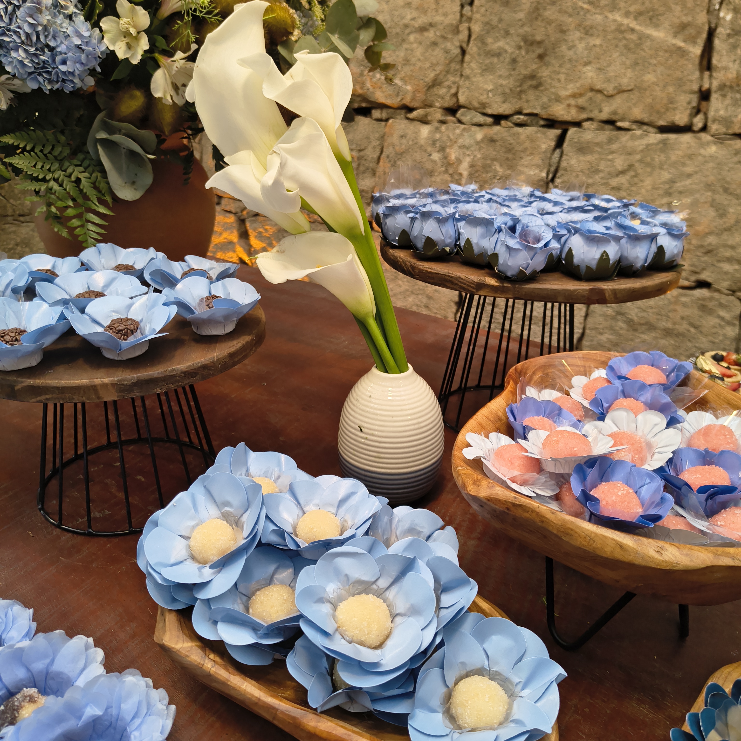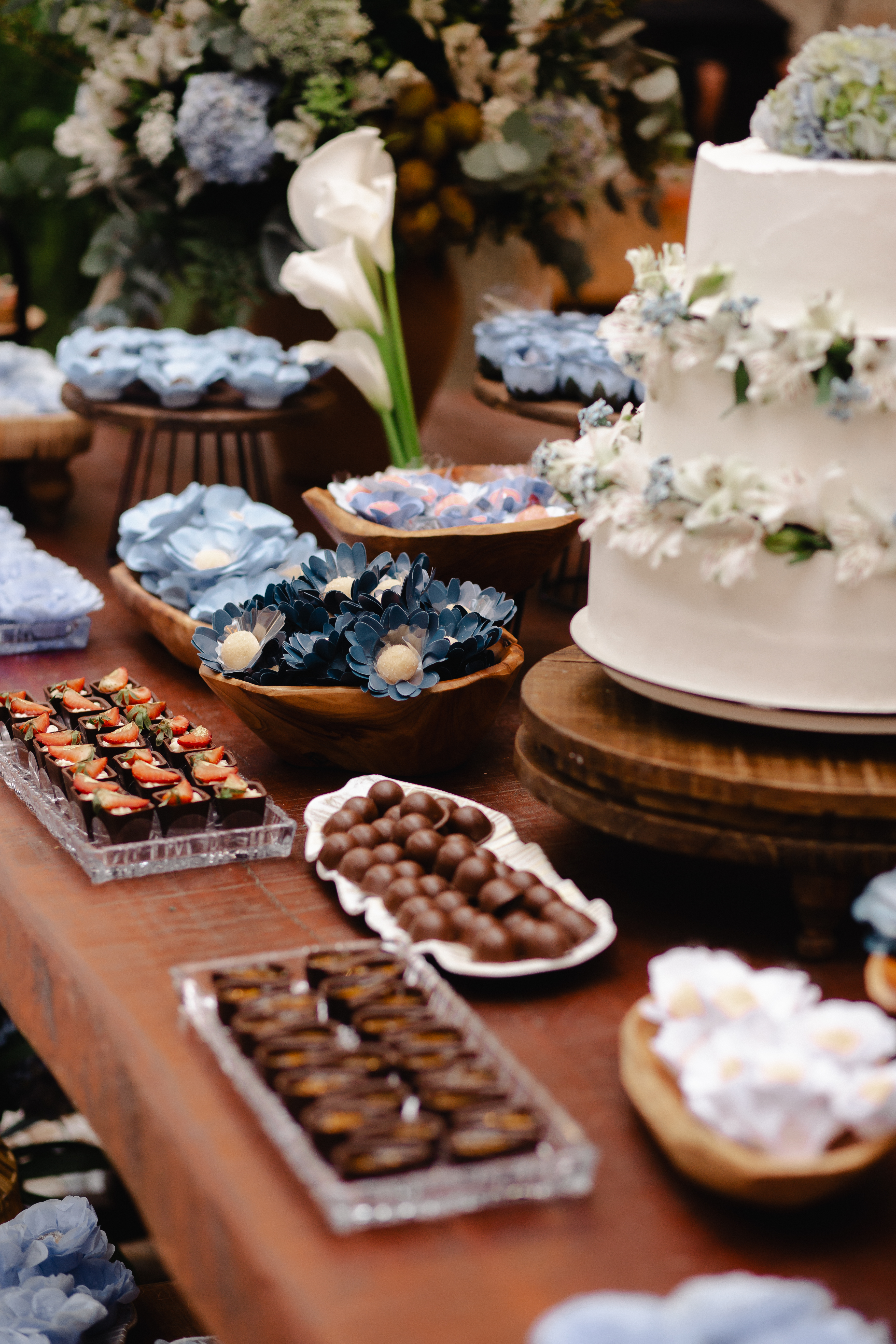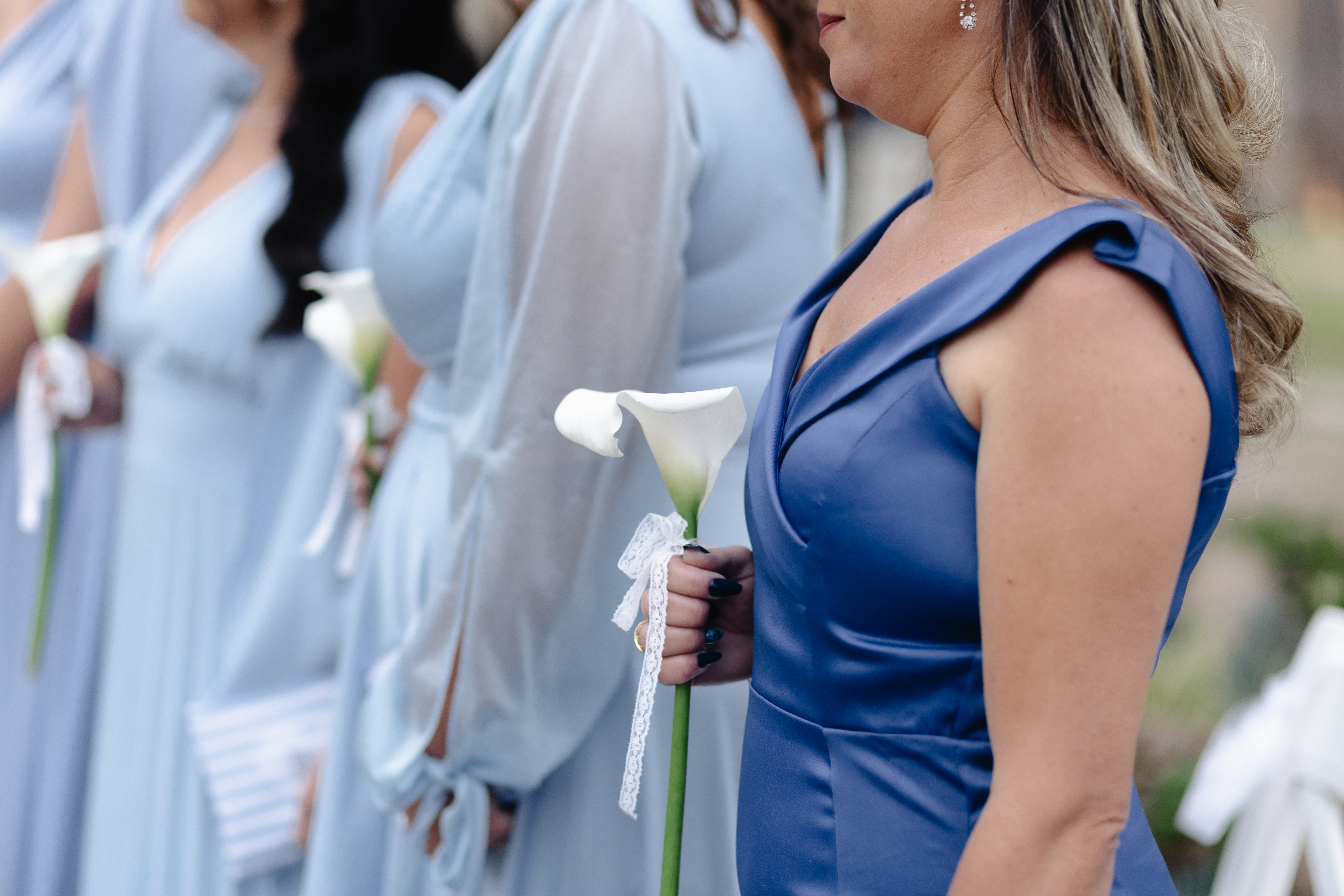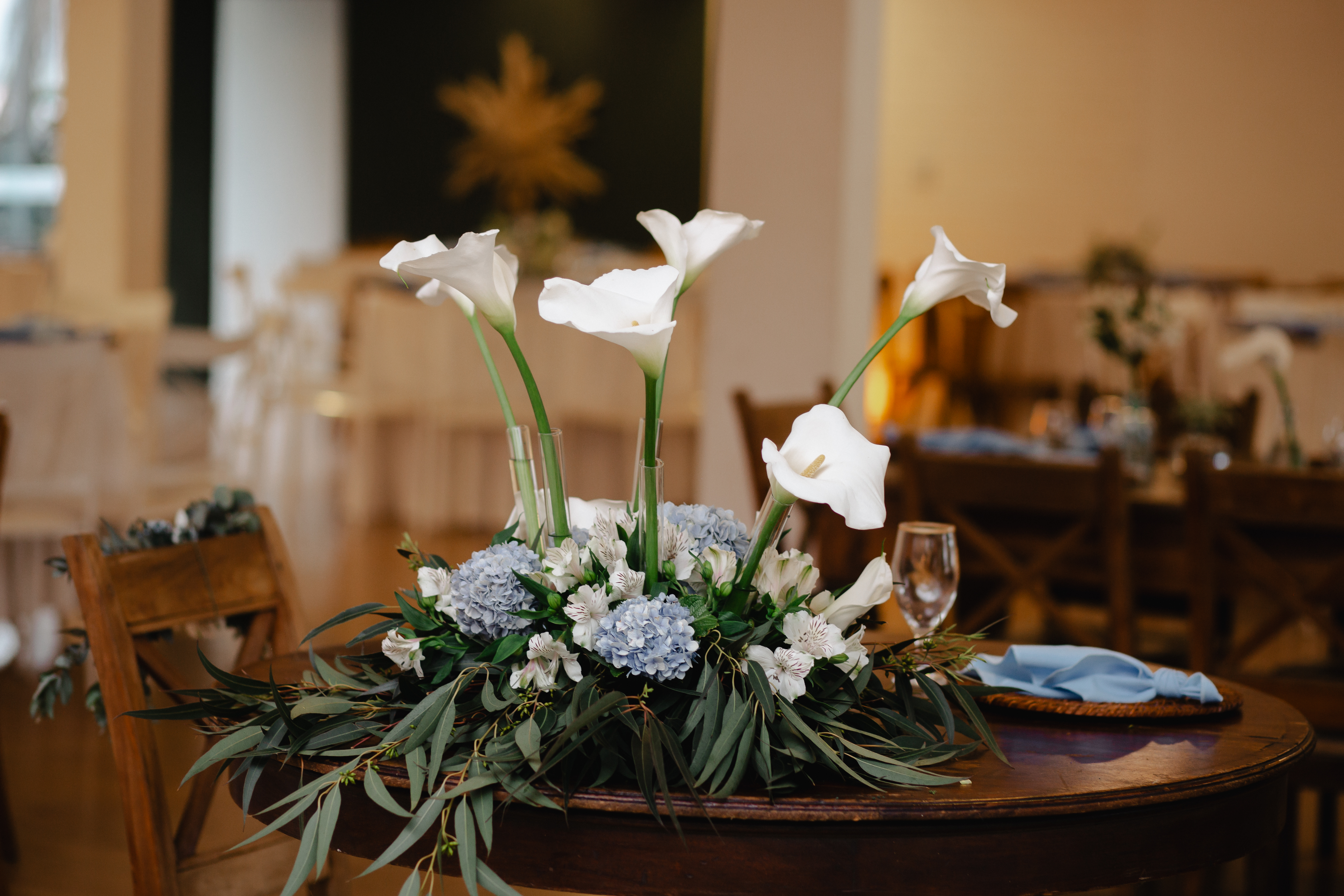 Em tons suaves de azul, a decoração trouxe frescor e romantismo, criando uma atmosfera serena e elegante. Os copos-de-leite, protagonistas da composição — e uma das grandes tendências atuais na decoração de casamentos — surgiram em meio ao verde, trazendo sofisticação natural e um toque contemporâneo ao ambiente.