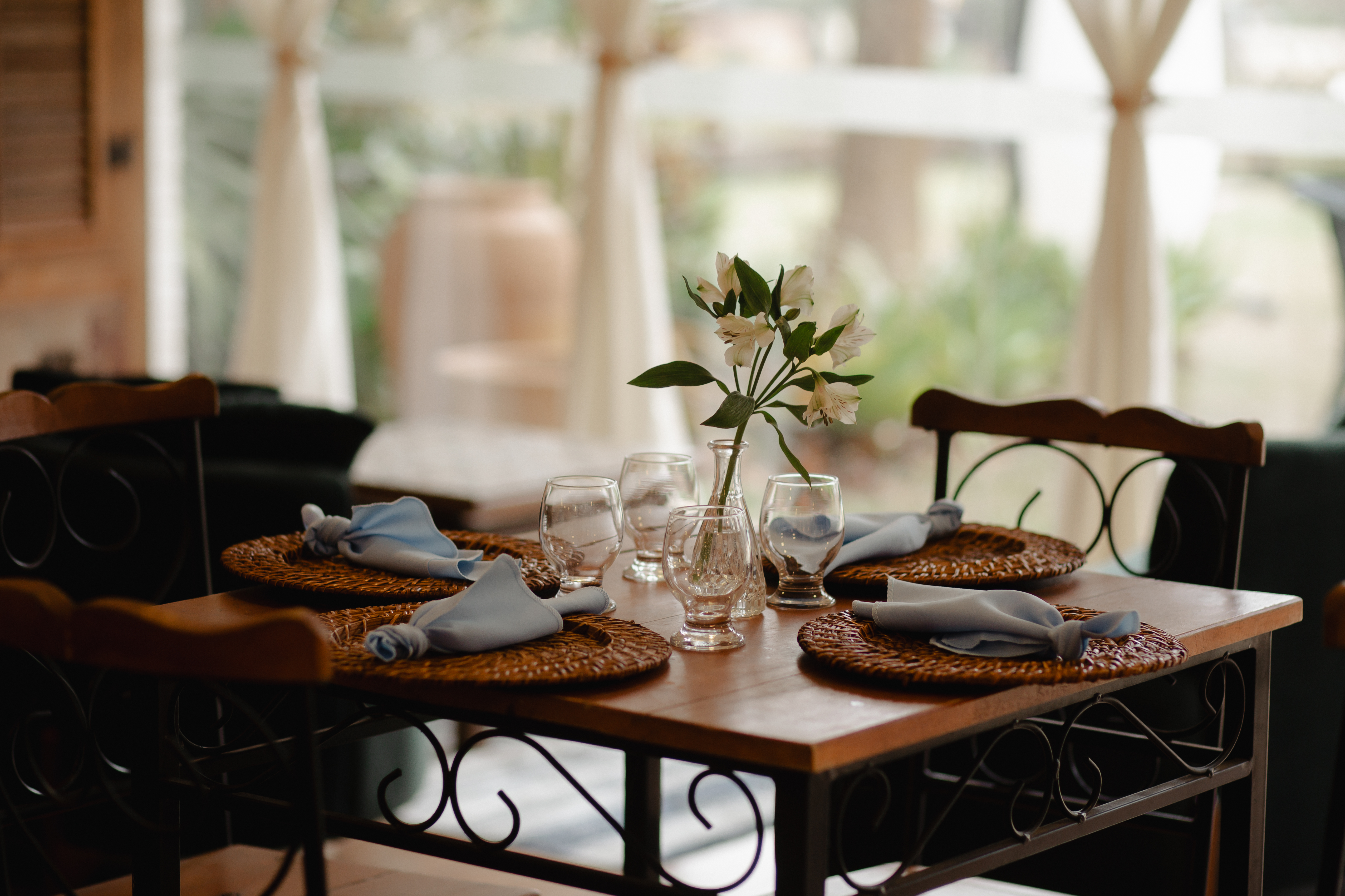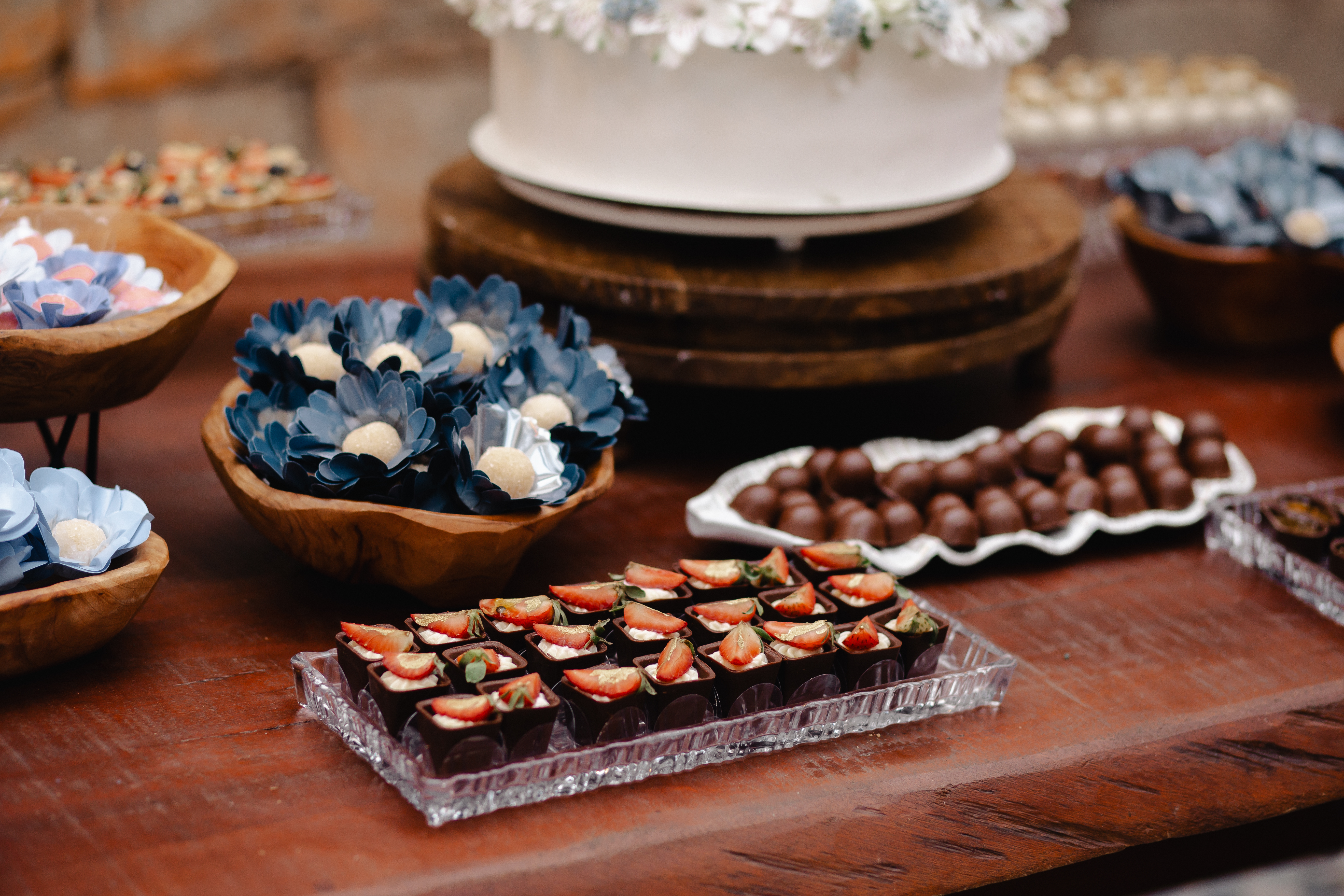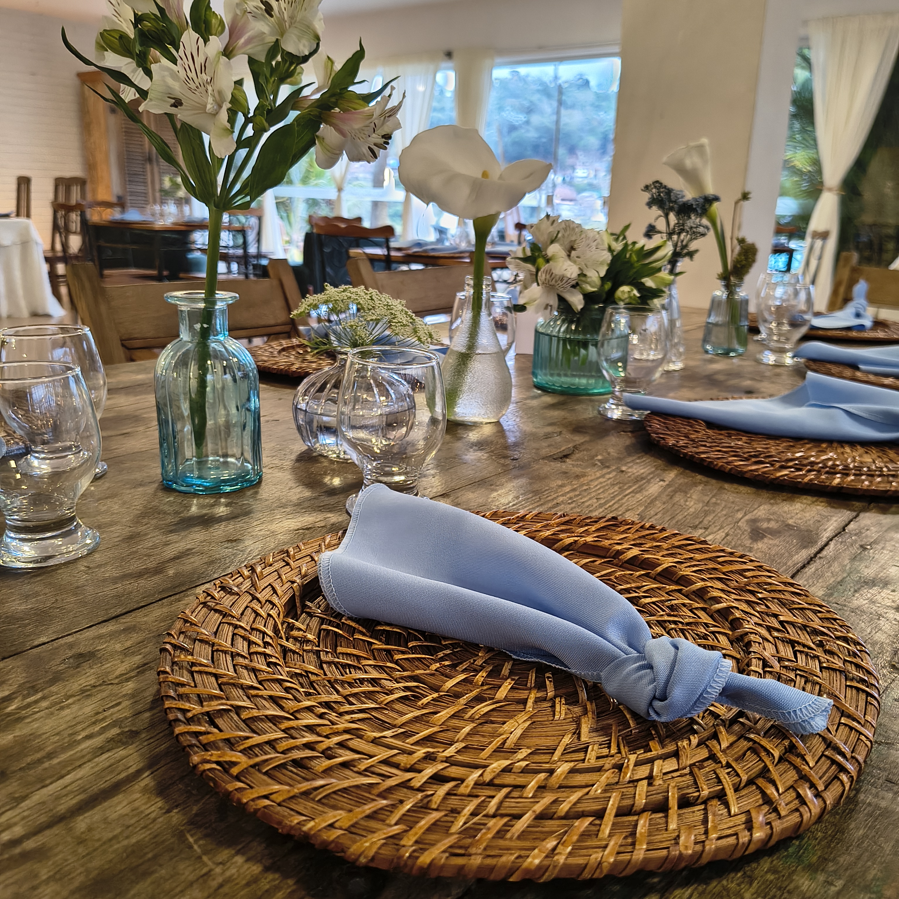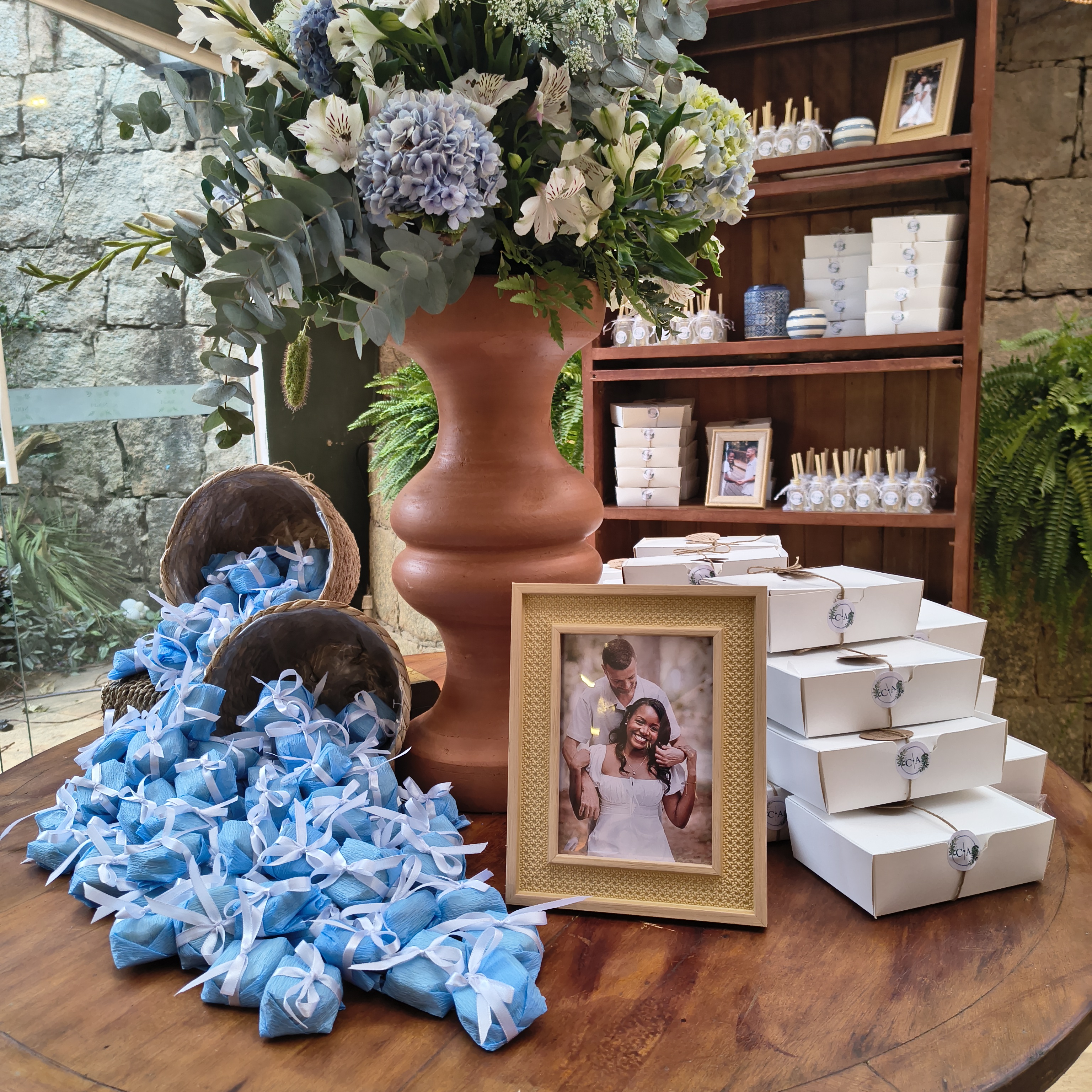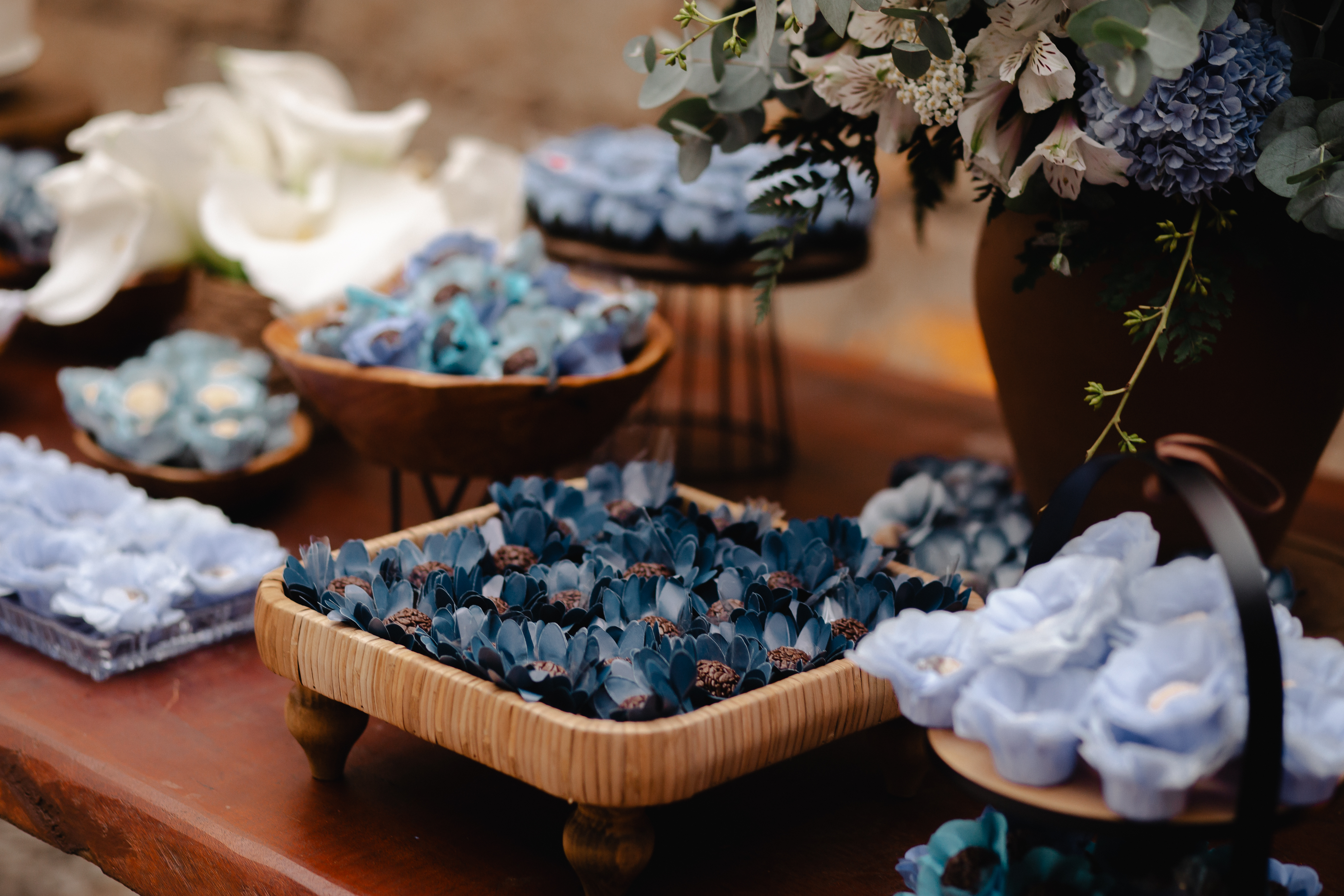 Em tons suaves de azul, a decoração trouxe frescor e romantismo, criando uma atmosfera serena e elegante. Os copos-de-leite, protagonistas da composição — e uma das grandes tendências atuais na decoração de casamentos — surgiram em meio ao verde, trazendo sofisticação natural e um toque contemporâneo ao ambiente.