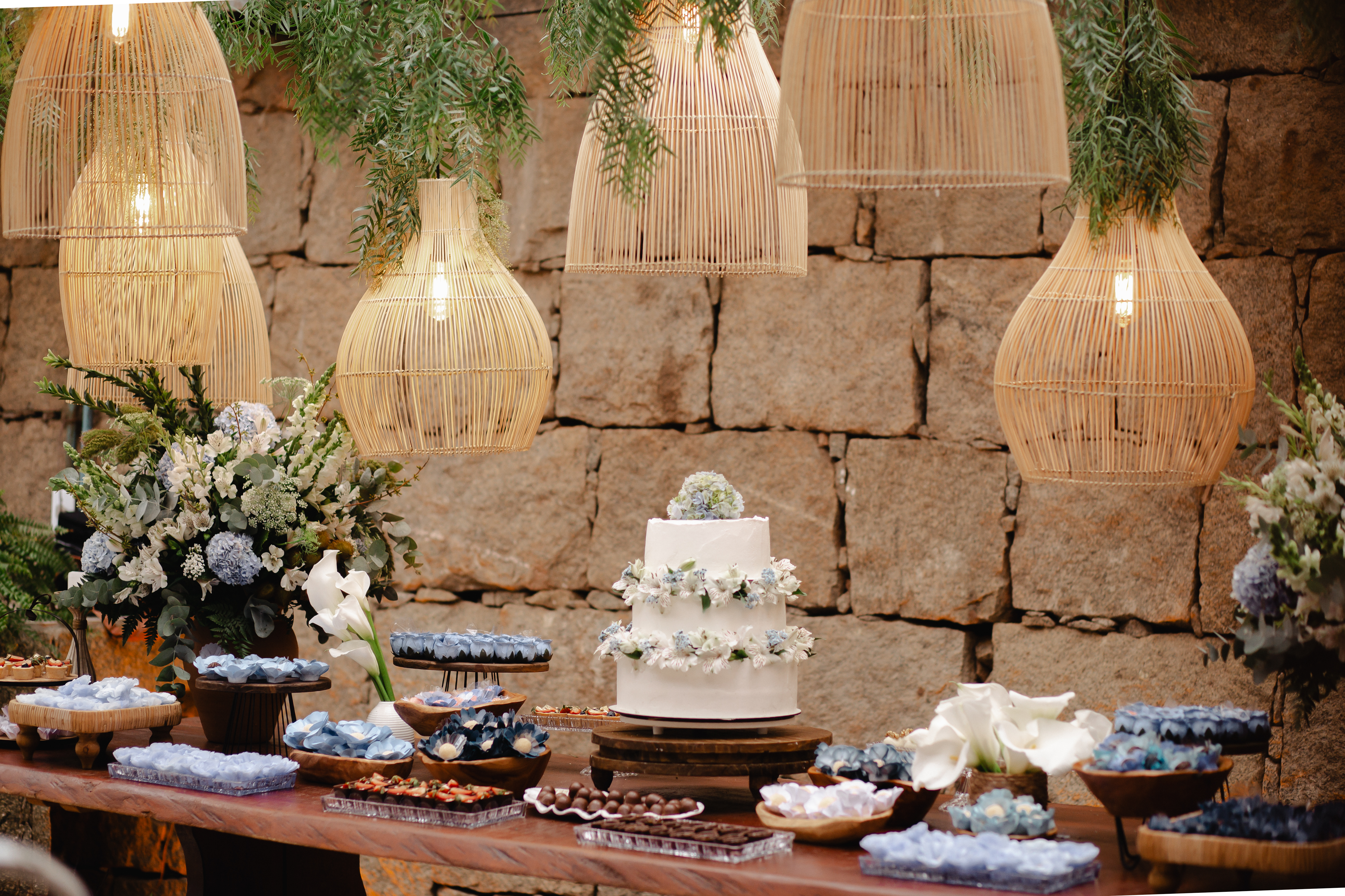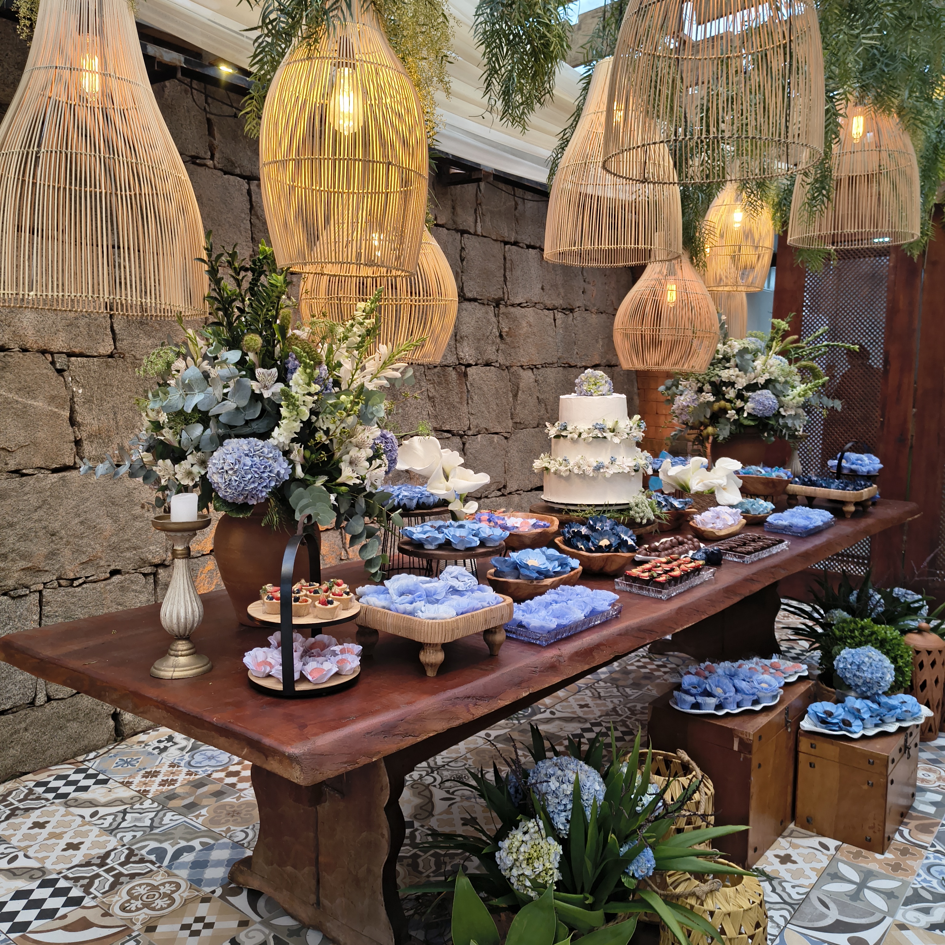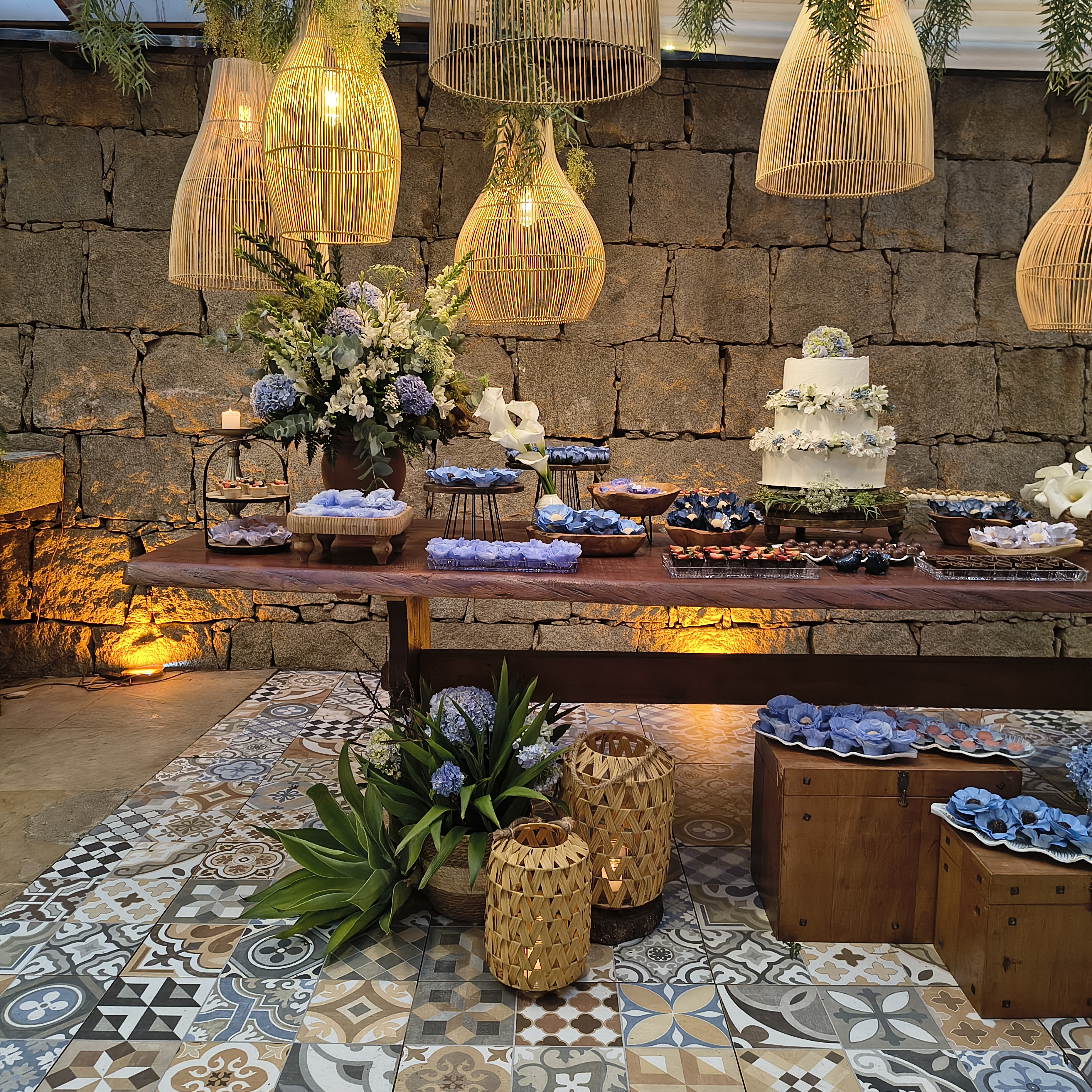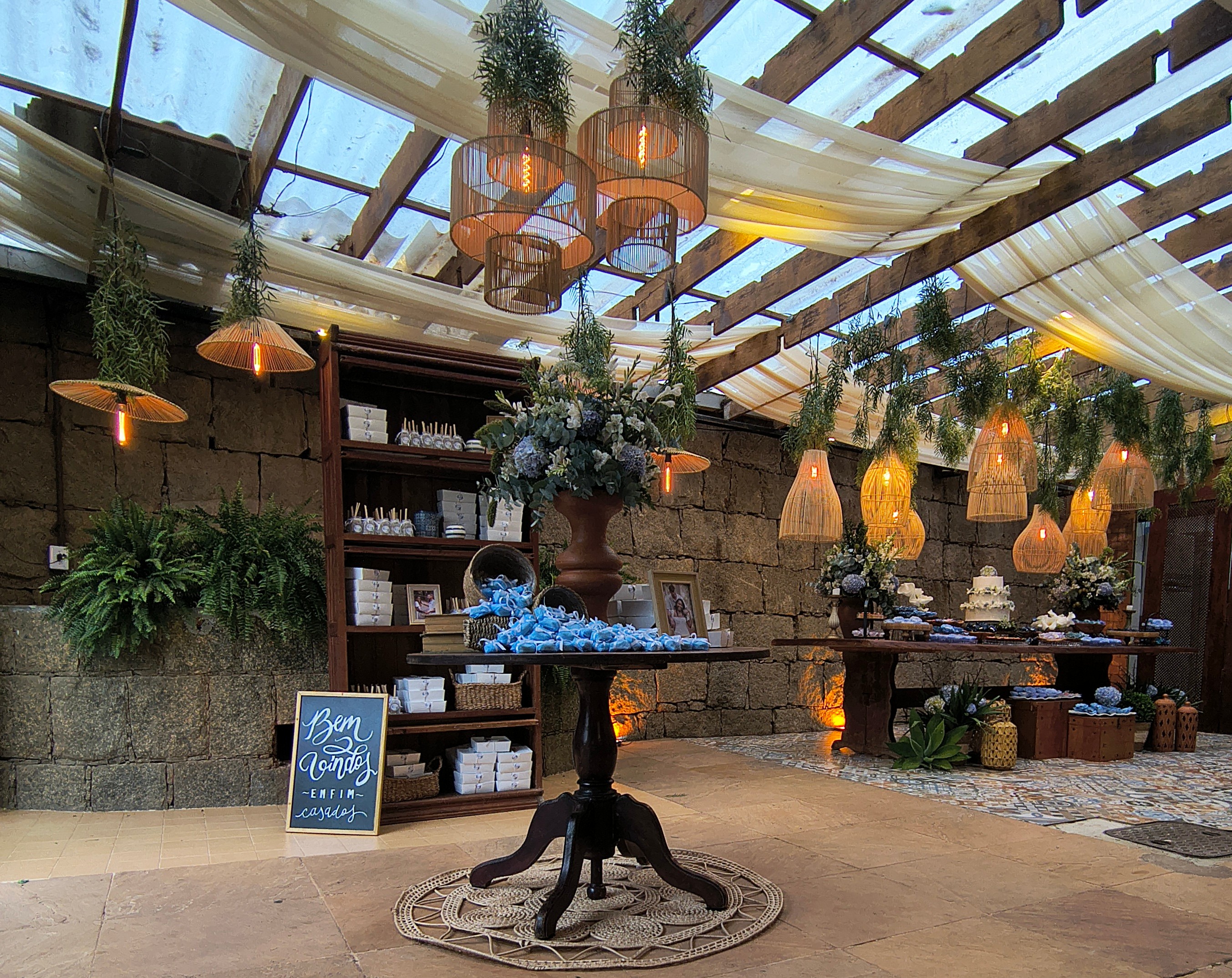 A proposta rústica e romântica ganhou força com elementos boho, cuidadosamente escolhidos: cestas artesanais, móveis em madeira, texturas naturais e lustres de bambu suspensos, que transformaram a iluminação em um verdadeiro abraço visual. Cada ponto de luz parecia aquecer o espaço, convidando os convidados a desacelerar, observar e sentir.