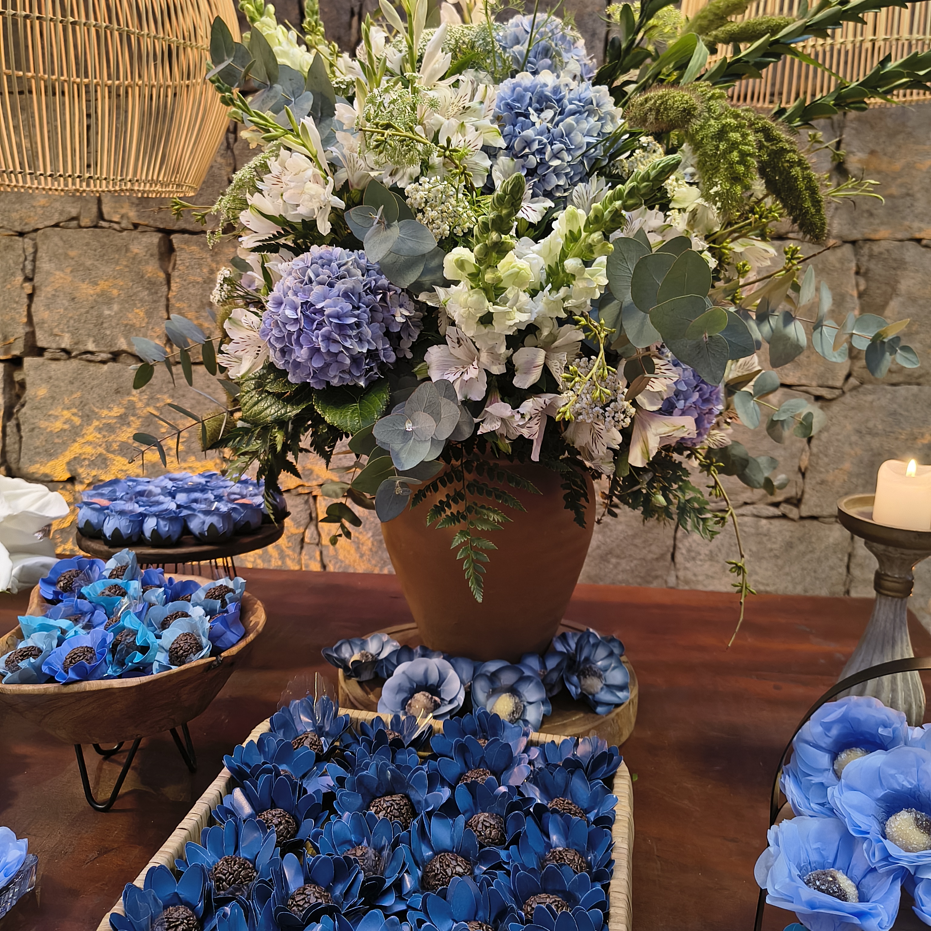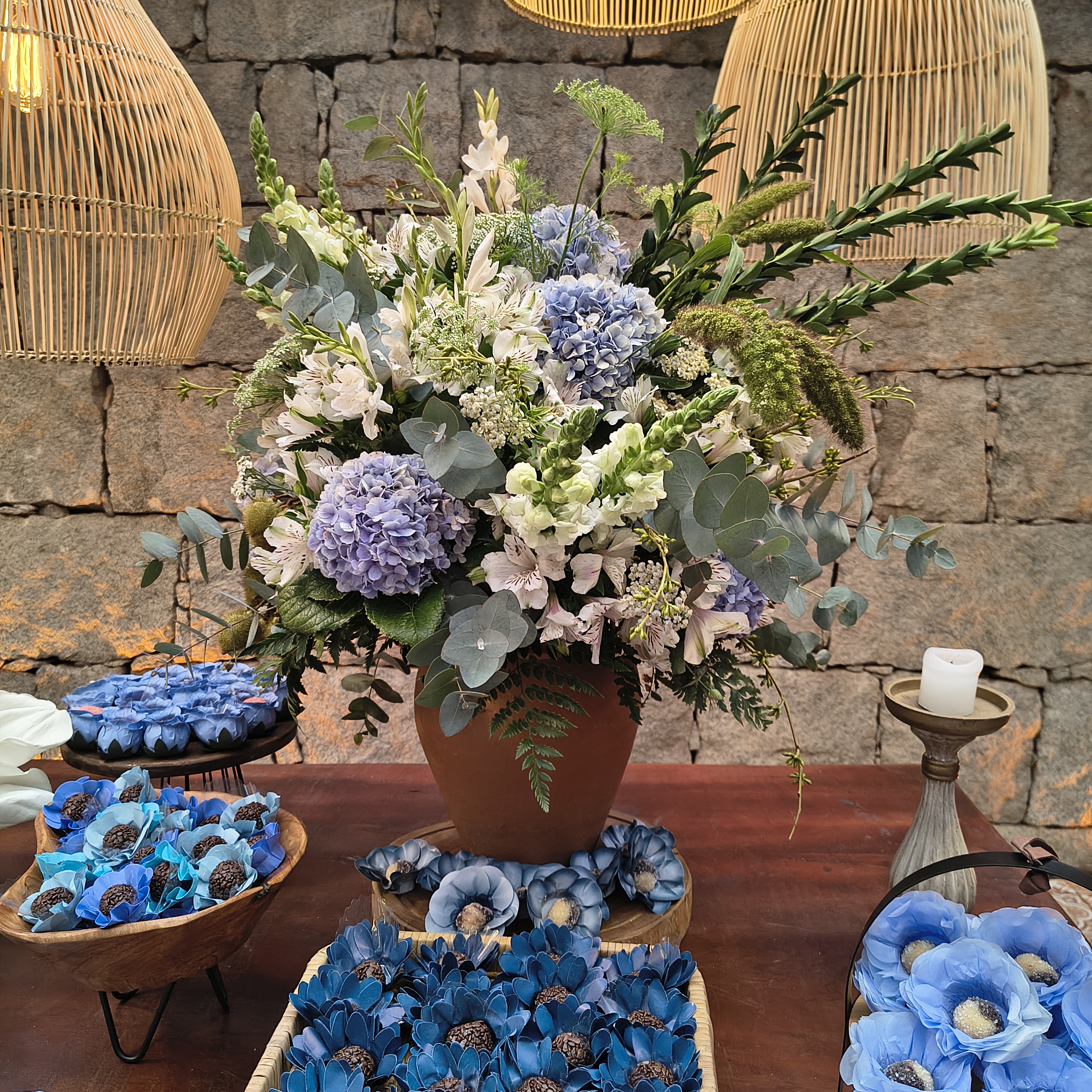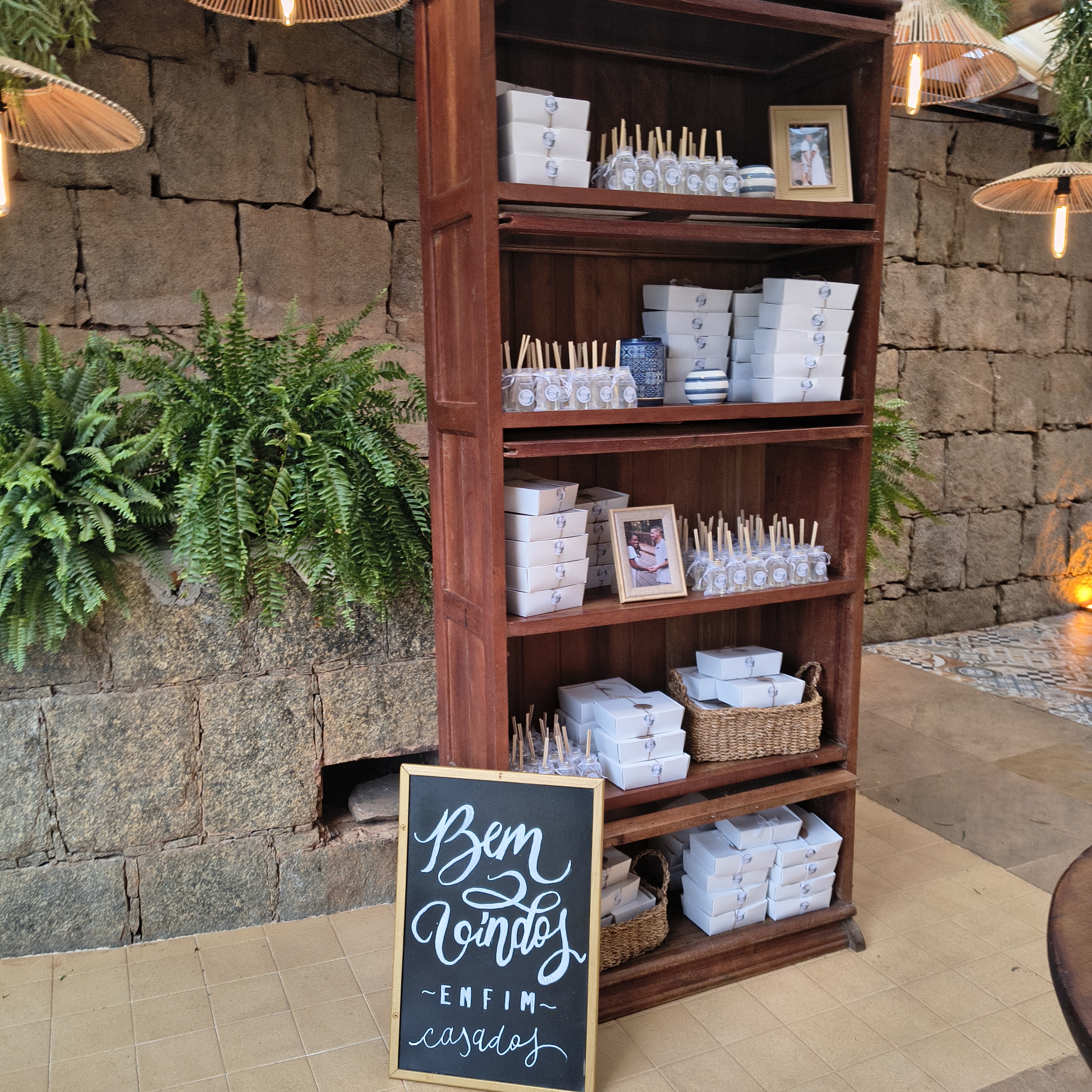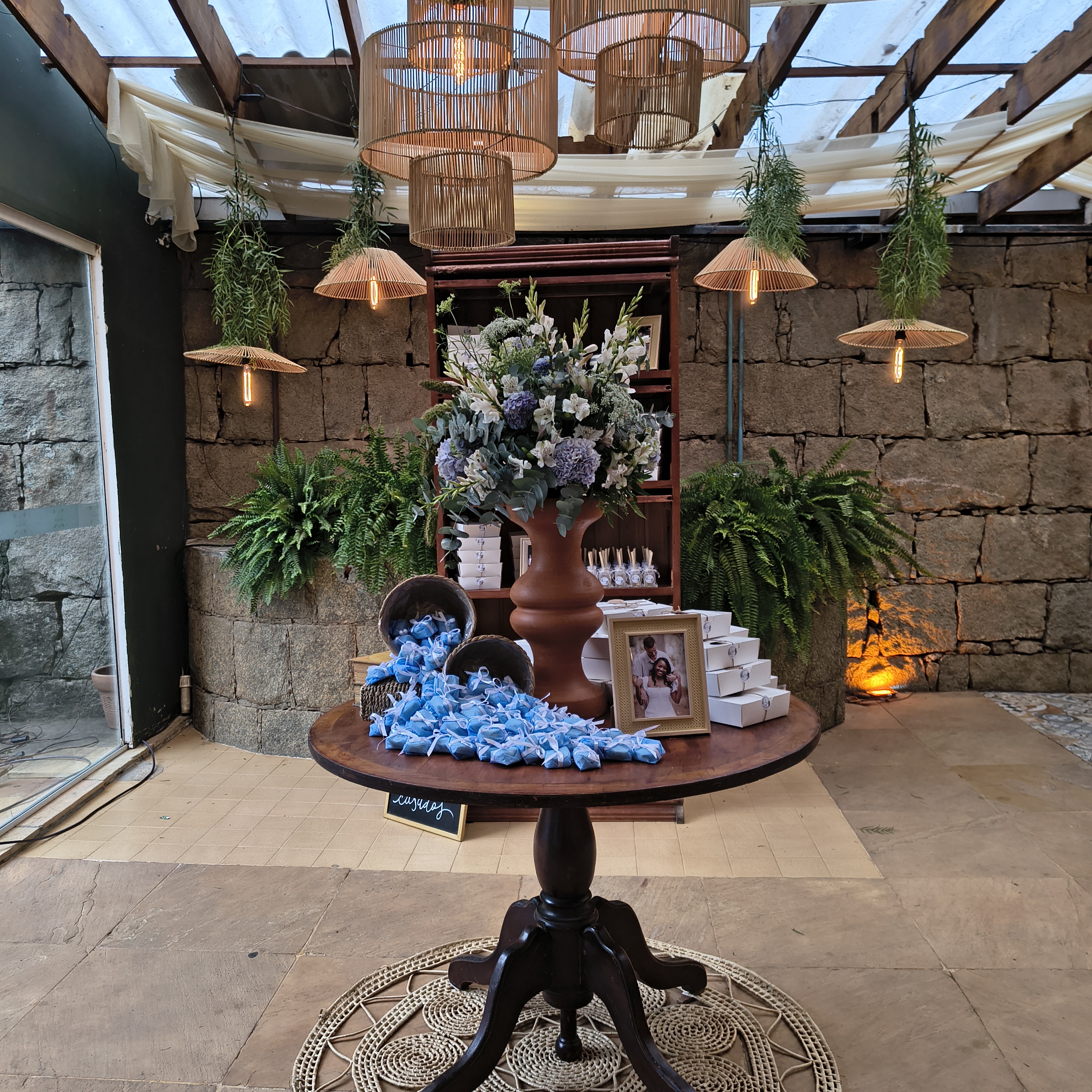 A proposta rústica e romântica ganhou força com elementos boho, cuidadosamente escolhidos: cestas artesanais, móveis em madeira, texturas naturais e lustres de bambu suspensos, que transformaram a iluminação em um verdadeiro abraço visual. Cada ponto de luz parecia aquecer o espaço, convidando os convidados a desacelerar, observar e sentir.